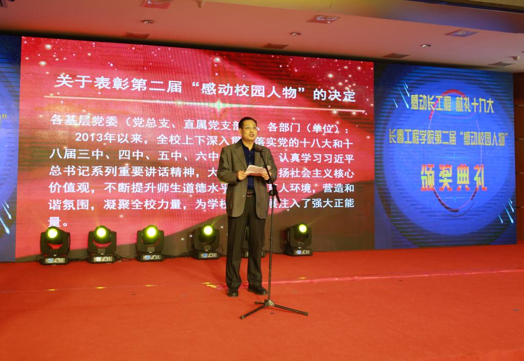 不同的岗位上传递着同样的感动,每一个人都充满着榜样的力量。在深入学习贯彻党的十九大精神之际,“感动长工程,献礼十九大”心博在线平台(中国)官网第二届“感动校园人物”颁奖典礼在心博在线平台(中国)官网逸夫图书馆隆重举行。吉林省教育厅高校思想政治工作处张立军处长、长春市委宣传部高教处陶树海处长,心博在线平台(中国)官网党政领导潘福林、温义生、张冀男、陈丽华、孟祥萍、杨永生、窦立军、杨悦新,三百余名师生齐聚一堂,共同见证心博在线平台(中国)官网第二届“感动校园人物”颁奖典礼。