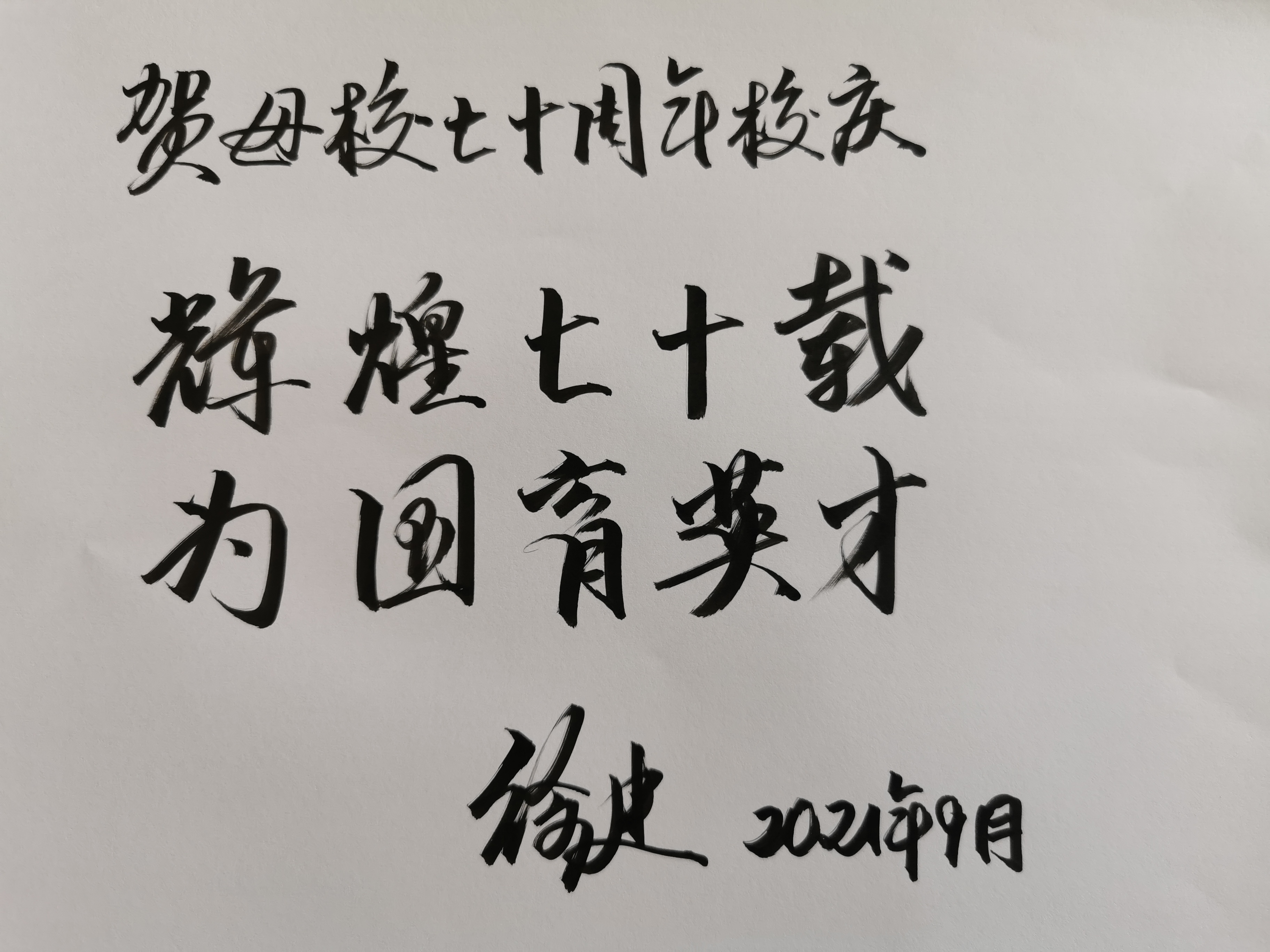 徐建院士的题词字字饱含深情与期望,对母校建校70年来取得的成绩予以充分的肯定;也激励着全体教职员工开拓进取,为国培育英才;更体现出对在校生的殷切期望,希望他们勤奋学习,树立远大理想,成为国家的栋梁之才。