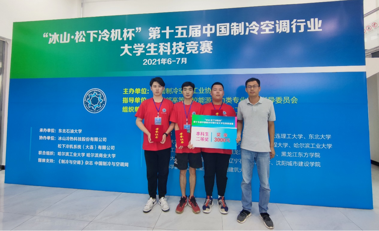 近日 “冰山·松下冷机杯”第十五届中国制冷空调行业大学生科技竞赛(东北赛区)在东北石油大学落下帷幕, 由我校能源动力工程学院张自国老师指导,建筑环境与能源应用工程专业2018级学生陈宇翔、邢永峰和2019级学生陈思伟组成的代表队获得本科生组二等奖。