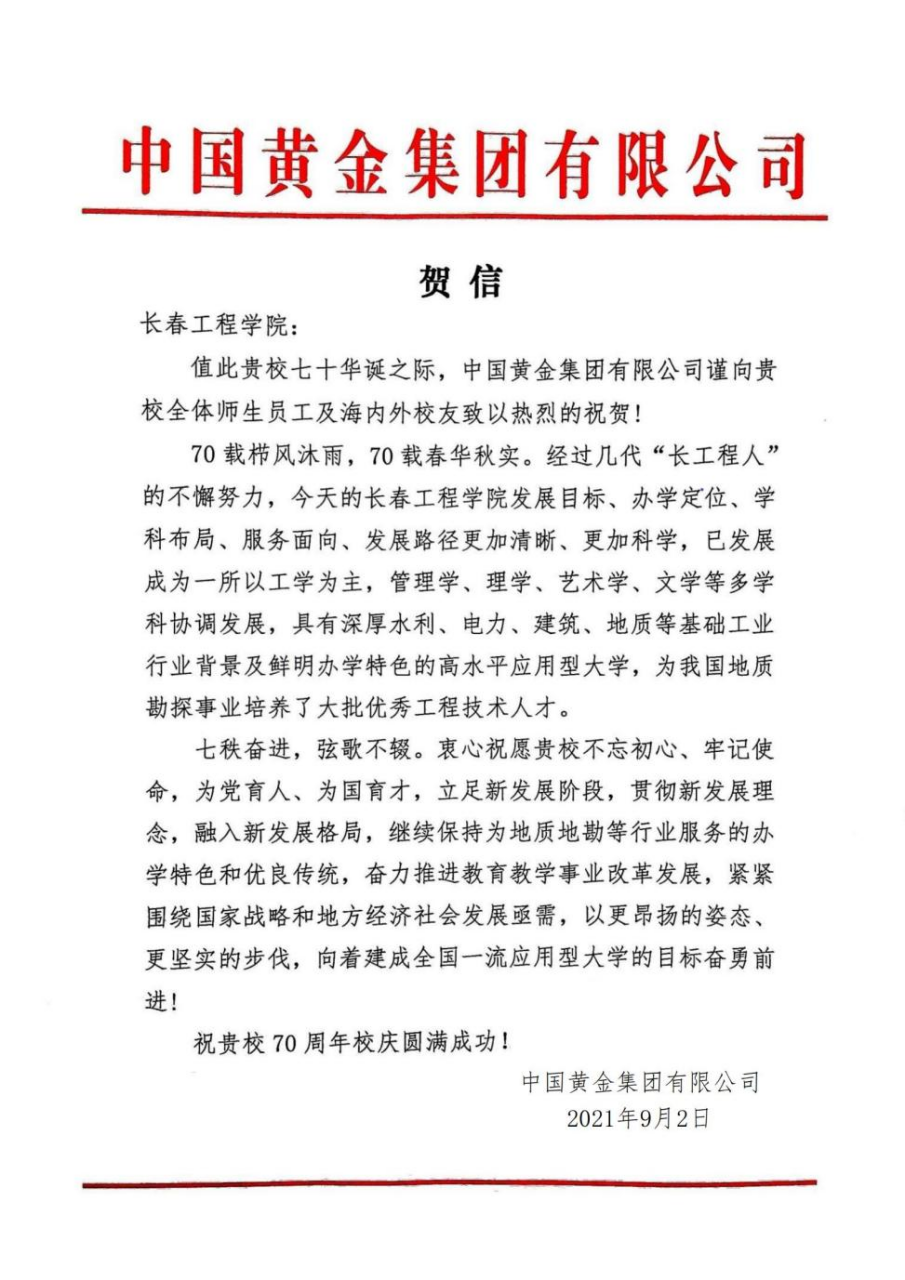 2021年9月3日,心博在线平台(中国)官网收到中国黄金集团有限公司发来的贺信,在心博在线平台(中国)官网建校70周年华诞来临之际,向心博在线平台(中国)官网全体师生员工及海内外校友致以热烈的祝贺!贺信全文如下:
