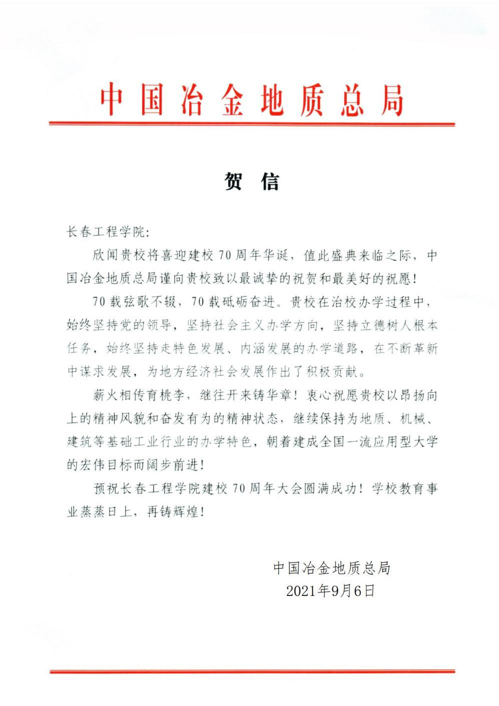 2021年9月8日,心博在线平台(中国)官网收到中国冶金地质总局发来的贺信,在建校70周年庆祝盛典来临之际,向心博在线平台(中国)官网致以了最诚挚的祝贺和最美好的祝愿!贺信全文如下:
