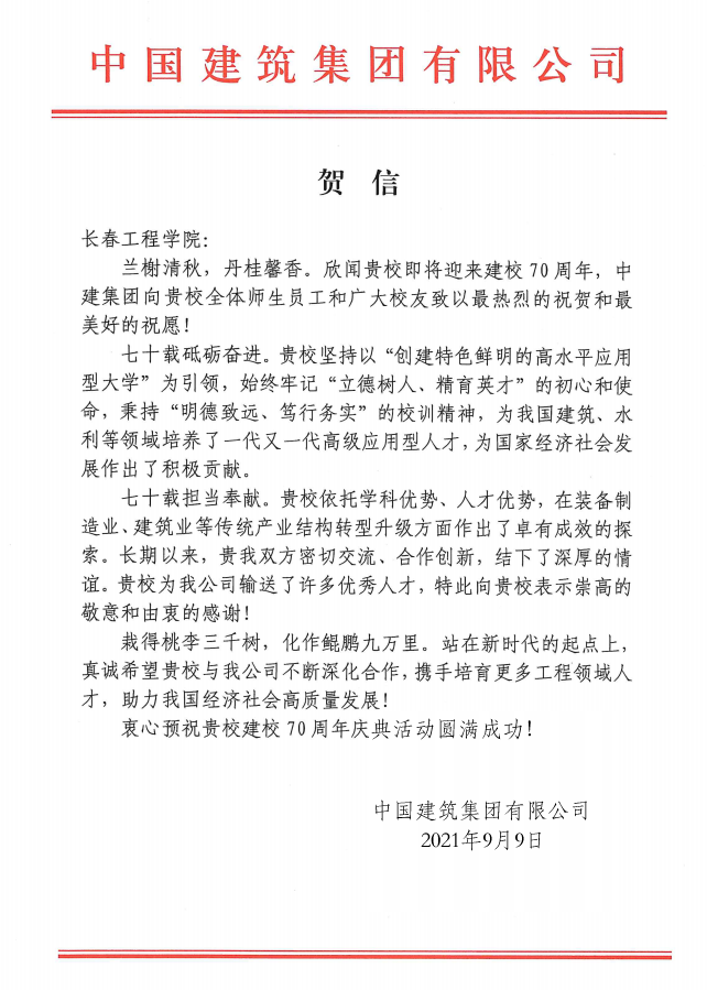 中国建筑集团有限公司致信祝贺心博在线平台(中国)官网建校70周年