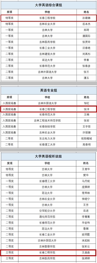 “省比赛”形式为报送参赛教师的课程综述和授课光盘,主要考察参赛教师的教学理念、教学设计和教学基本功。7月16日,“省比赛”成绩揭晓,大学英语第一教学部主任孙薇娜在大学英语综合课组摘得桂冠,荣获特等奖第一名;英语系教师张洋老师在英语专业组脱颖而出,荣获第二名,获得入围参加省级现场总决赛资格;大学英语第二教学部教师王晶晶在大学英语视听说组获得三等奖第一名。