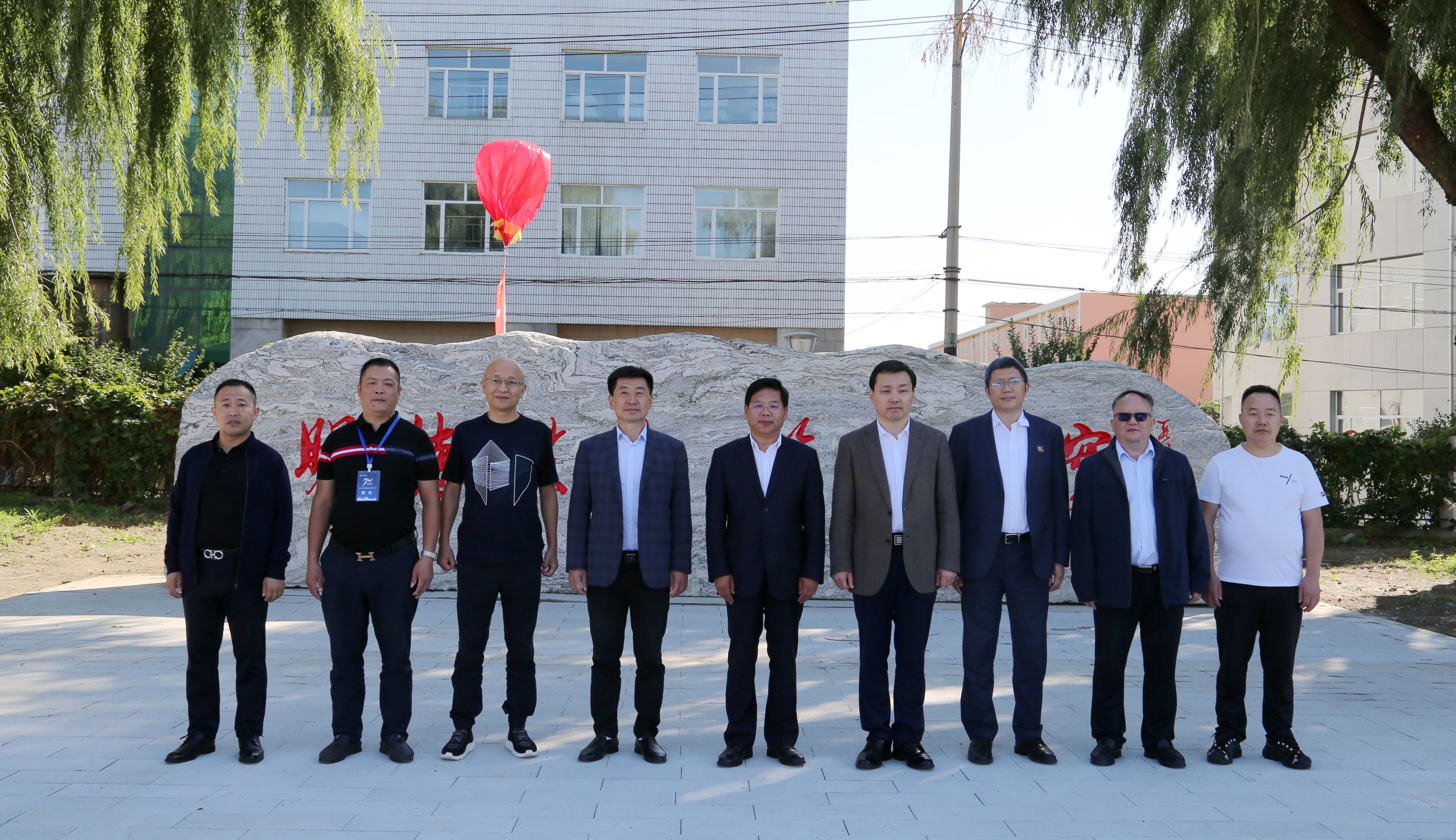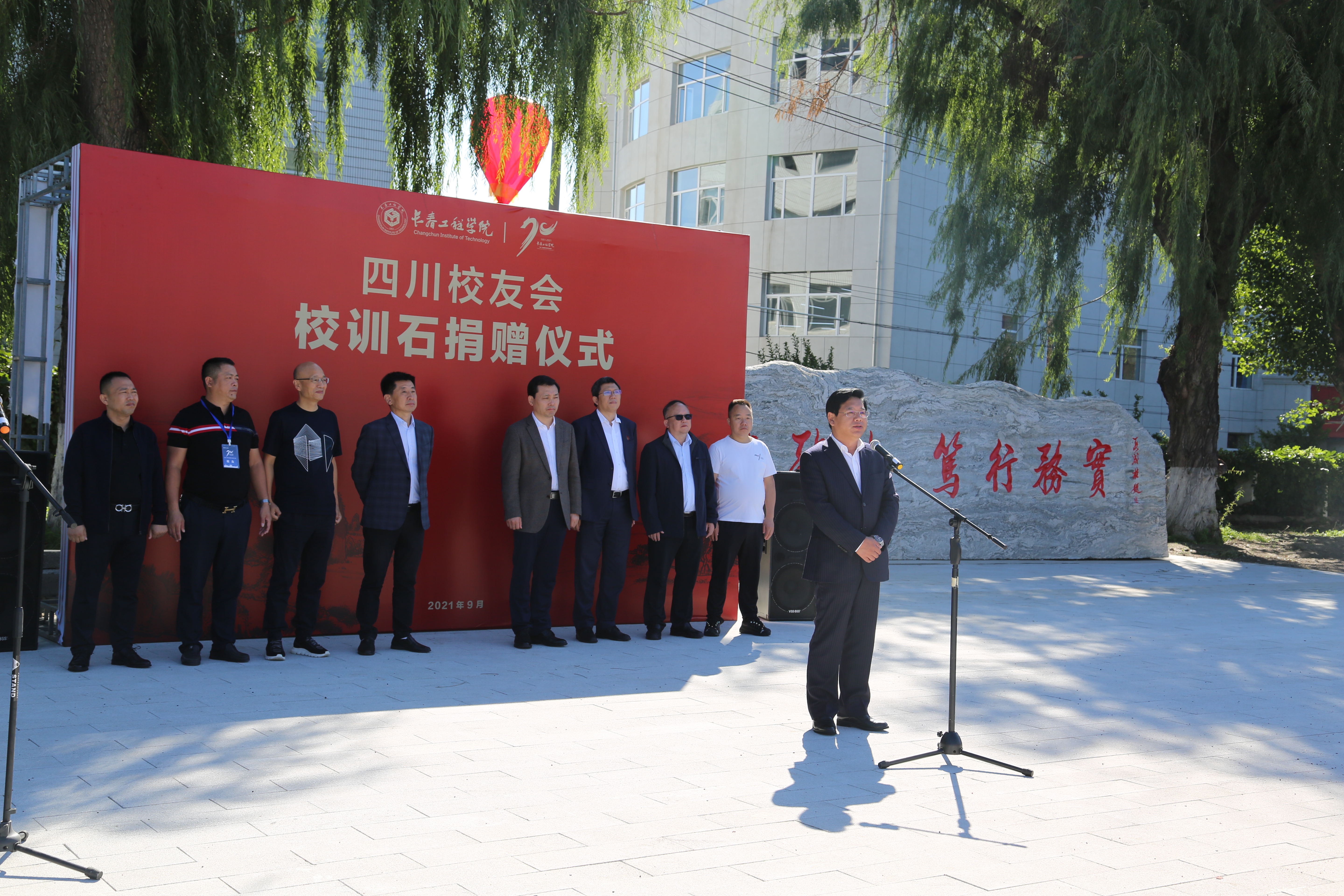 陈权校长向四川校友会颁发捐赠证书,心博在线平台(中国)官网领导及校友代表共同在校训石前合影留念。