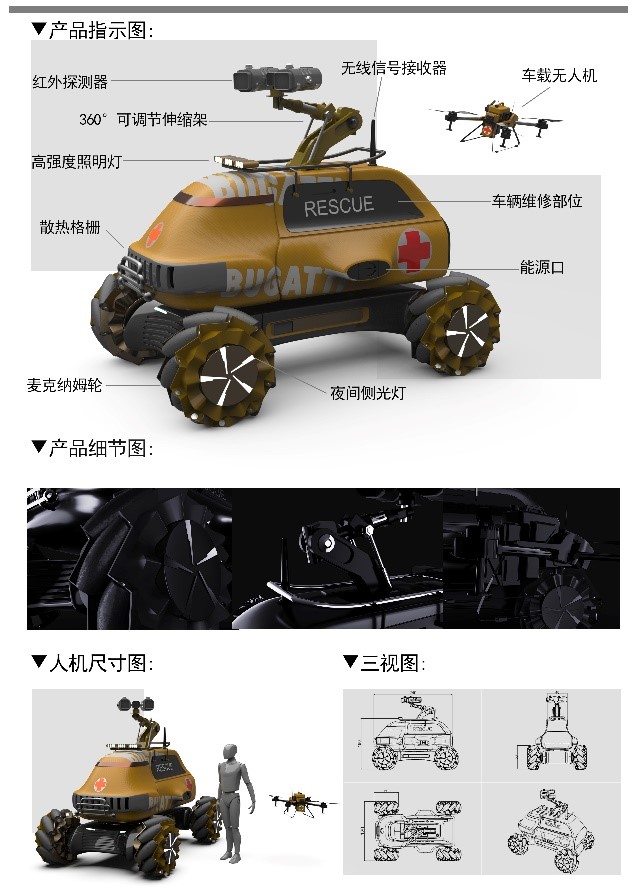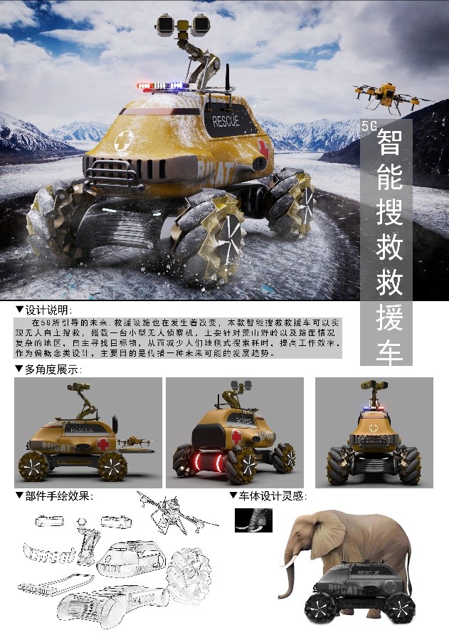 一等奖作品展示:《5G智能搜救救援车》-产品设计专业19级 郭少康等。