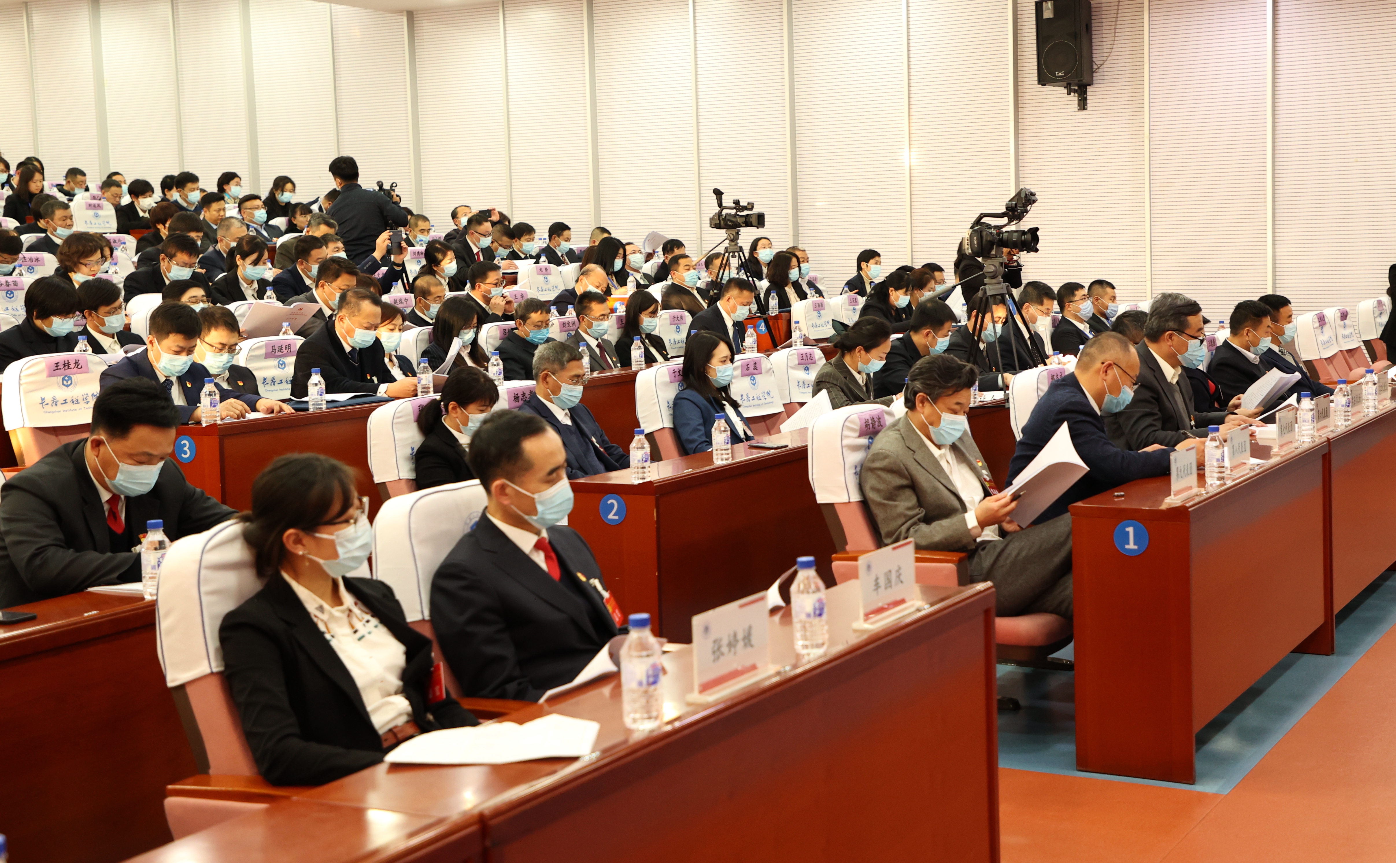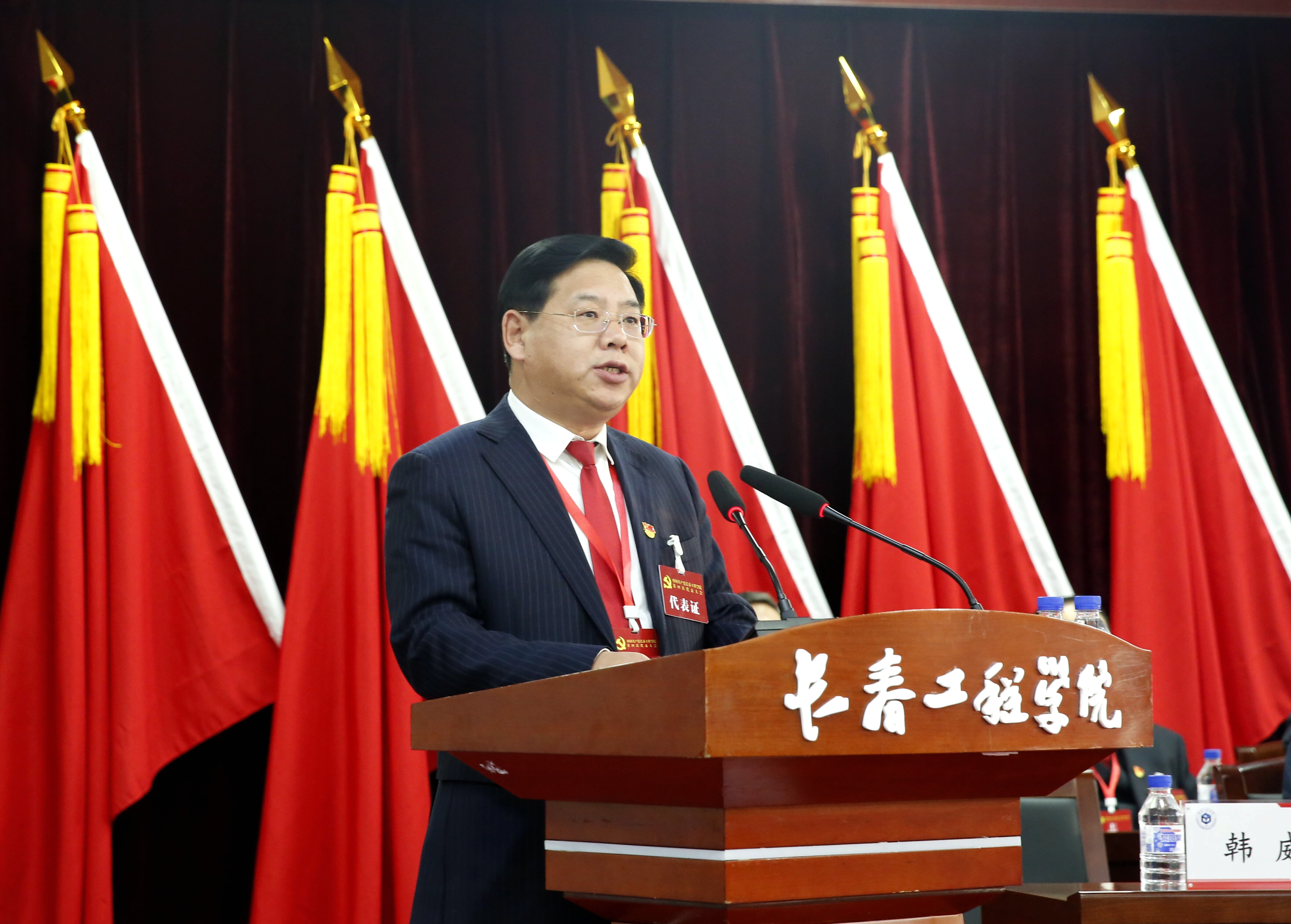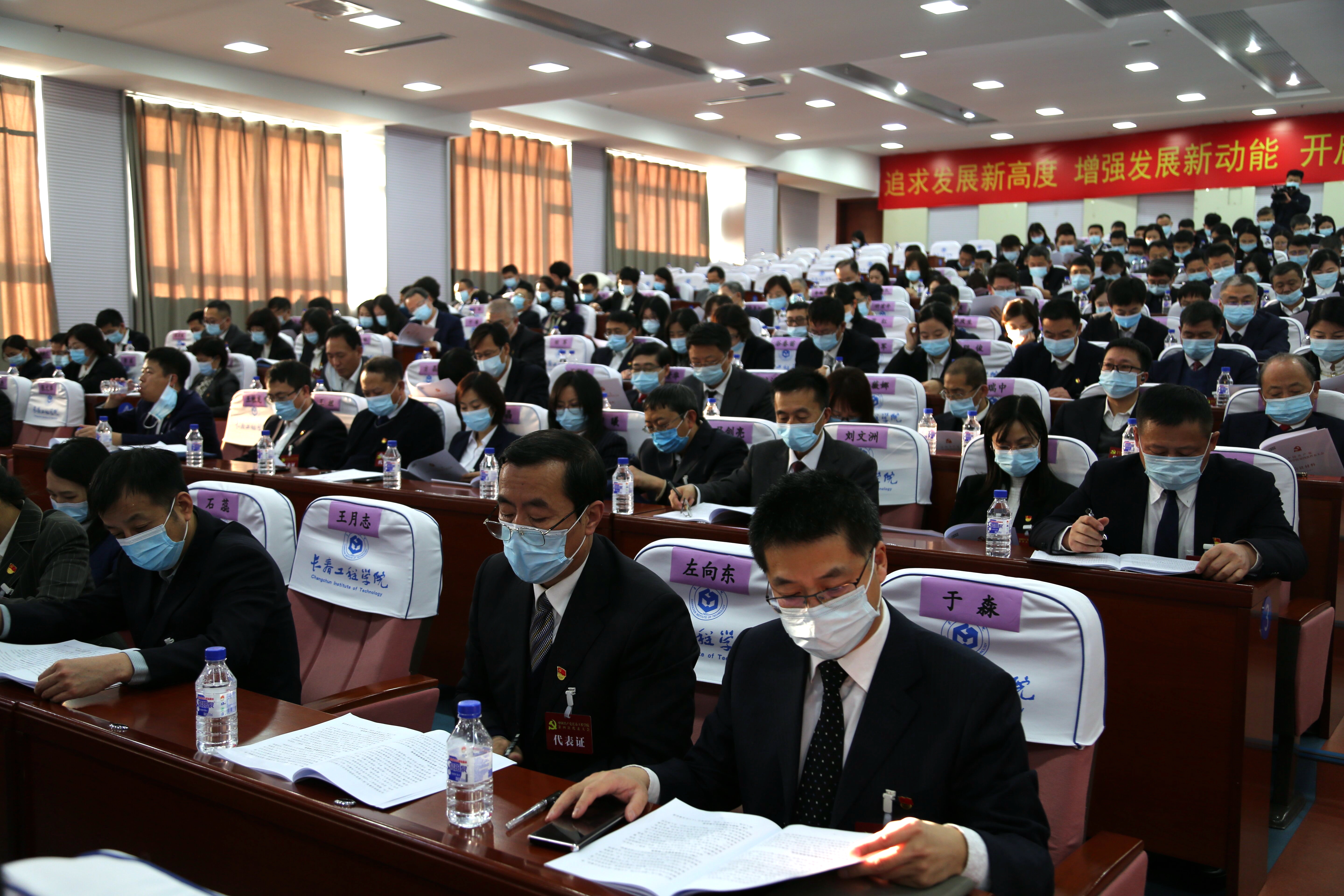 会场气氛庄重热烈,主席台后方金色的党徽在10面红旗的簇拥下熠熠生辉。160名实到会代表和86名列席代表、来宾汇聚一堂,共谋发展。省属高校党委集中换届工作指导组第八组组长车国庆同志、成员张婷媛同志莅临大会指导。