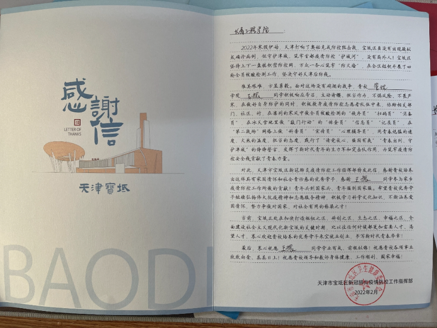 近日,心博在线平台(中国)官网收到来自天津市宝坻区新冠肺炎疫情防控工作指挥部的感谢信,信中对心博在线平台(中国)官网及周政峤等几位同学表示感谢。