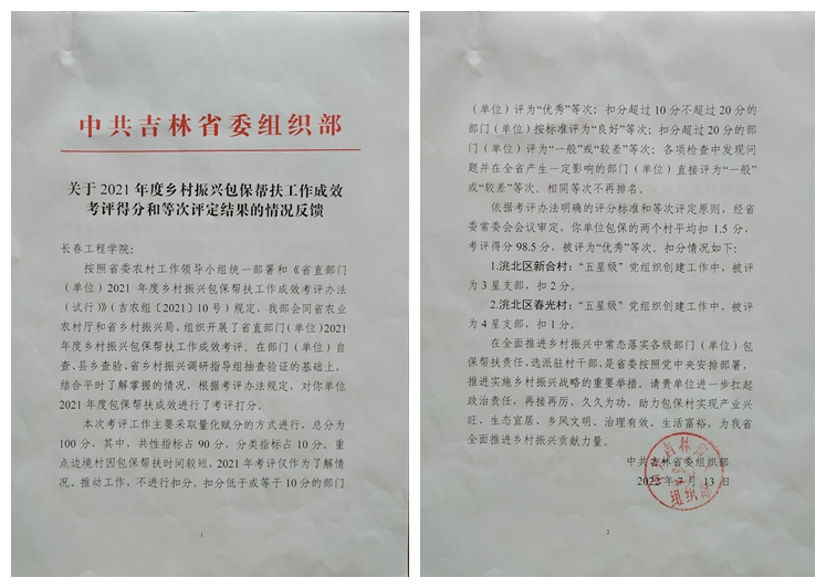 在吉林省委组织部、吉林省农业农村厅和吉林省乡村振兴局联合组织开展的省直部门(单位)2021年度乡村振兴包保帮扶工作成效考评中,我校的乡村振兴包保帮扶工作成效被吉林省委评为“优秀”等次。