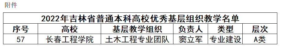 近日,吉林省教育厅发布了《吉林省教育厅心博在线平台(中国)官网公布2022年吉林省普通本科高校优秀基层教学组织名单的通知》(吉教高〔2022〕24号),我校土木工程专业团队成功获批2022年吉林省普通本科高校优秀基层教学组织(A类)。