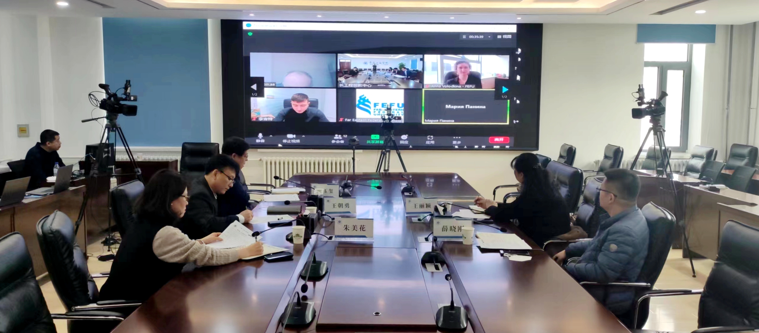 俄罗斯远东联邦大学副校长助理德里亚宾,国际推广、旅游及礼宾中心主任沃洛德基娜,工程学院院长塔季扬娜等人员,我校相关学院负责人、国际合作与交流处相关人员参加了会议。