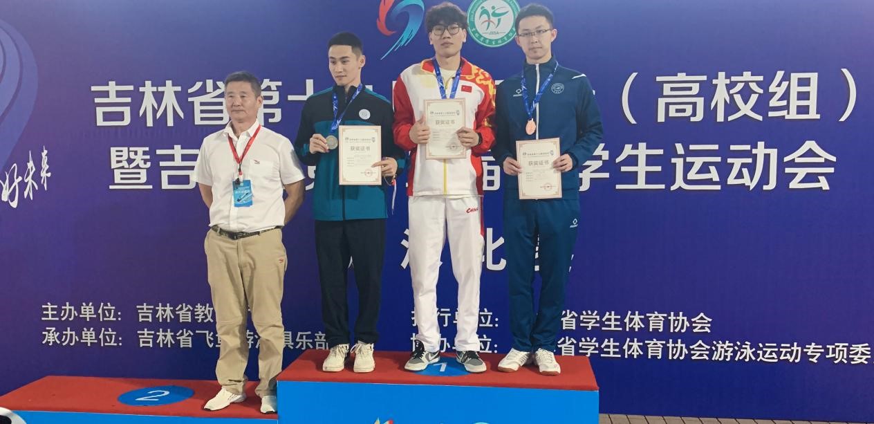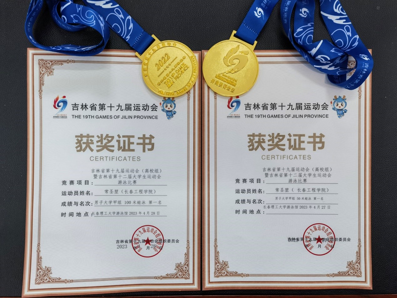 近日,在吉林省第十九届运动会(高校组)暨吉林省第十二届大学生运动会游泳比赛中,我校建筑学院常圣堃同学,在大学甲组男子50米蛙泳和100米蛙泳比赛中,分别以32''66和1'17''36的好成绩勇夺两枚金牌。