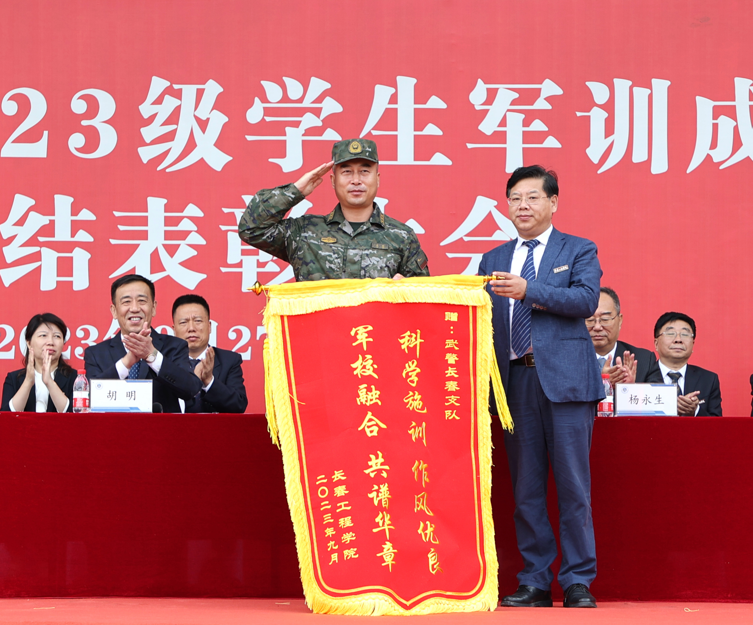 校长陈权代表全校师生,向承训部队赠送锦旗,感谢他们的恪尽职守,艰苦付出。