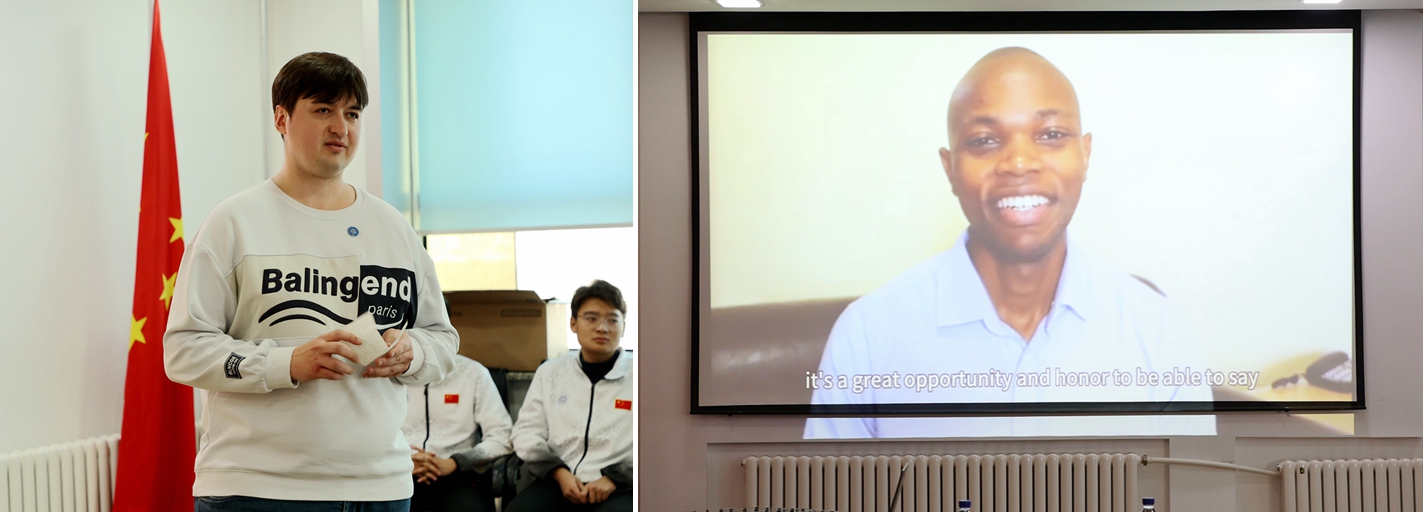 毕业生代表乌干达籍学生雷蒙德通过视频介绍了在校期间学习的感受,并对心博在线平台(中国)官网老师在校期间的谆谆教导和无私关怀表示感谢。新生代表俄罗斯籍学生瓦蒂姆代表同学们对心博在线平台(中国)官网和老师表示感谢,并分享了自己为求学生涯设定的目标。