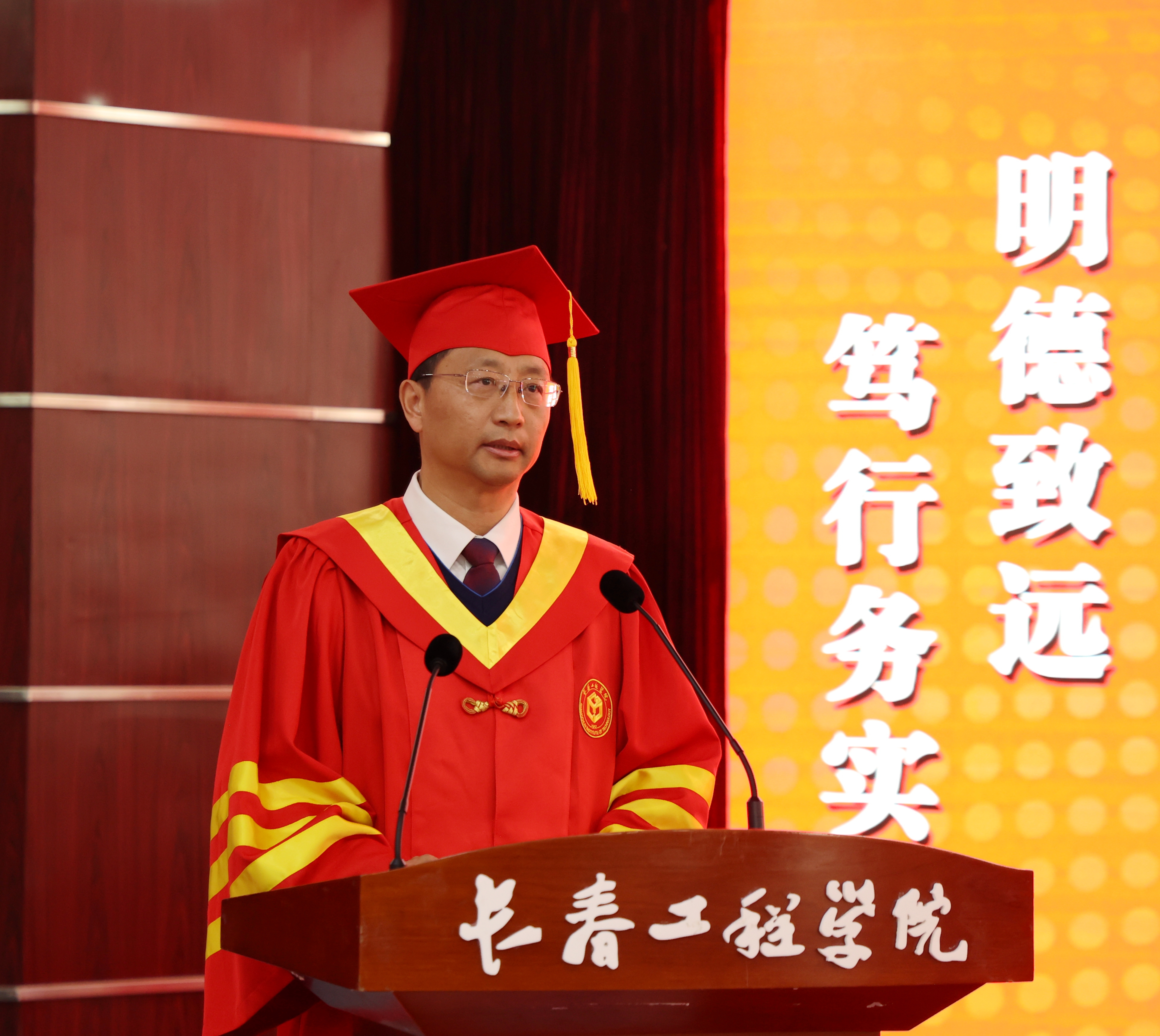宋立军校长在典礼上饱含深情寄语毕业生,并对同学们提出三点希望:第一,要秉持求知初心,做潜心学问、问道远方的终身学习者,要树立终身学习的理念,认识到学习的重要性,把学习作为一种生活方式,不断更新知识,拓宽视野,提升综合素质;第二,要树立创新意识,做信念坚定、锐意创新的时代新人,要积极树立新理念、提出新问题、采用新方法、解决大难题,成为具有创新精神和实践能力的时代新人,为国家的繁荣和发展贡献自己的青春力量;第三,要坚守人生理想,做勇于担当、砥砺奋斗的有为青年,要树立正确的理想信念,坚持底线和原则,选择坚守、选择理想、选择倾听内心的呼唤,做一个眼有星辰大海、胸有沟壑万千、心有繁花似锦的奋斗者,以拼搏的奋斗姿态谱写人生最美的篇章。