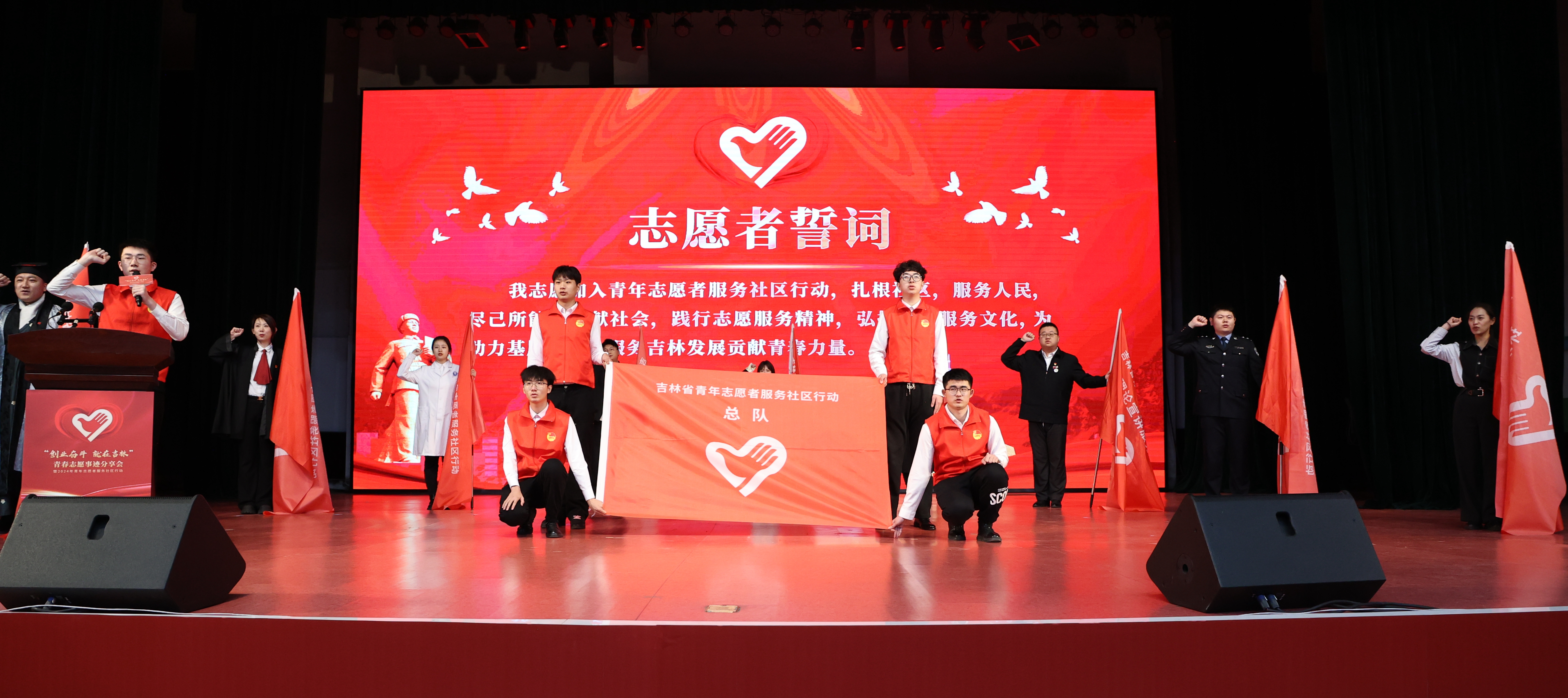 省委社会工作部副部长纪纲、团省委副书记周佳、我校党委副书记刘兆国为吉林省青年志愿者服务社区行动服务队代表授旗。