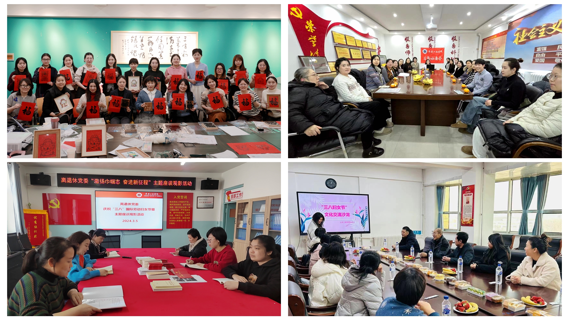 各基层妇委会也开展了形式多样、丰富多彩的活动,机关党委组织开展了主题为“奋进新时代 巾帼绽芳华”的年画印制实践活动;后勤党委邀请专业医师为大家进行健康培训,详细介绍常见感冒症状的辨别以及如何选择对应的中成药,帮助大家在日常生活中更好地照顾自己和家人的健康;离退休党委开展“激扬巾帼志 奋进新征程”主题座谈会,大家分享了工作、生活中的收获感悟,释放了压力、增强了自信、增进了彼此之间的友谊,大家将以更加积极健康的心态,更好地面对工作和生活;土木工程学院开展“创须眉之先 争巾帼之优”主题座谈会,女教师代表分别从教学、科研、人才培养等方面进行了分享,并在分享的过程中品尝了自制的美食;水利与环境工程学院妇委会组织开展了“做大咖 品咖味”咖啡品鉴活动,精心准备了咖啡制作工具、咖啡伴侣及小食,大家在品尝亲手制作的各式咖啡饮品的同时,分享工作中的趣事,探讨教学中的问题,度过了难忘的美好时光;计算机技术与工程学院妇委会开展“关爱自我 心中有法”普法知识茶话会活动,组织女教职工学习《妇女权益保障法》《未成年人保护法》,并就防止未成年人沉迷网络等热点问题进行重点讨论;理学院妇委会利用自有实验室资源举办“鲜花物语”制作护手霜活动,不仅让女性教职工们感受到了节日的喜悦和温暖,也进一步提升了她们的归属感和幸福感;外国语学院举行“赴春天之约 绽美丽芳华”插花体验活动,特邀插花老师教授插花知识和技巧,还组织了现场即兴文艺表演活动,让女教职工们在芬芳享受与实践乐趣中共度节日、感受幸福;图书馆妇委会组织女教职工开展观影活动,精彩的电影让大家感悟到,积极心态是拥有获得感幸、福感的基础,只要坚持不懈、不言放弃,生命中的每一点光都可以成为前行的力量。