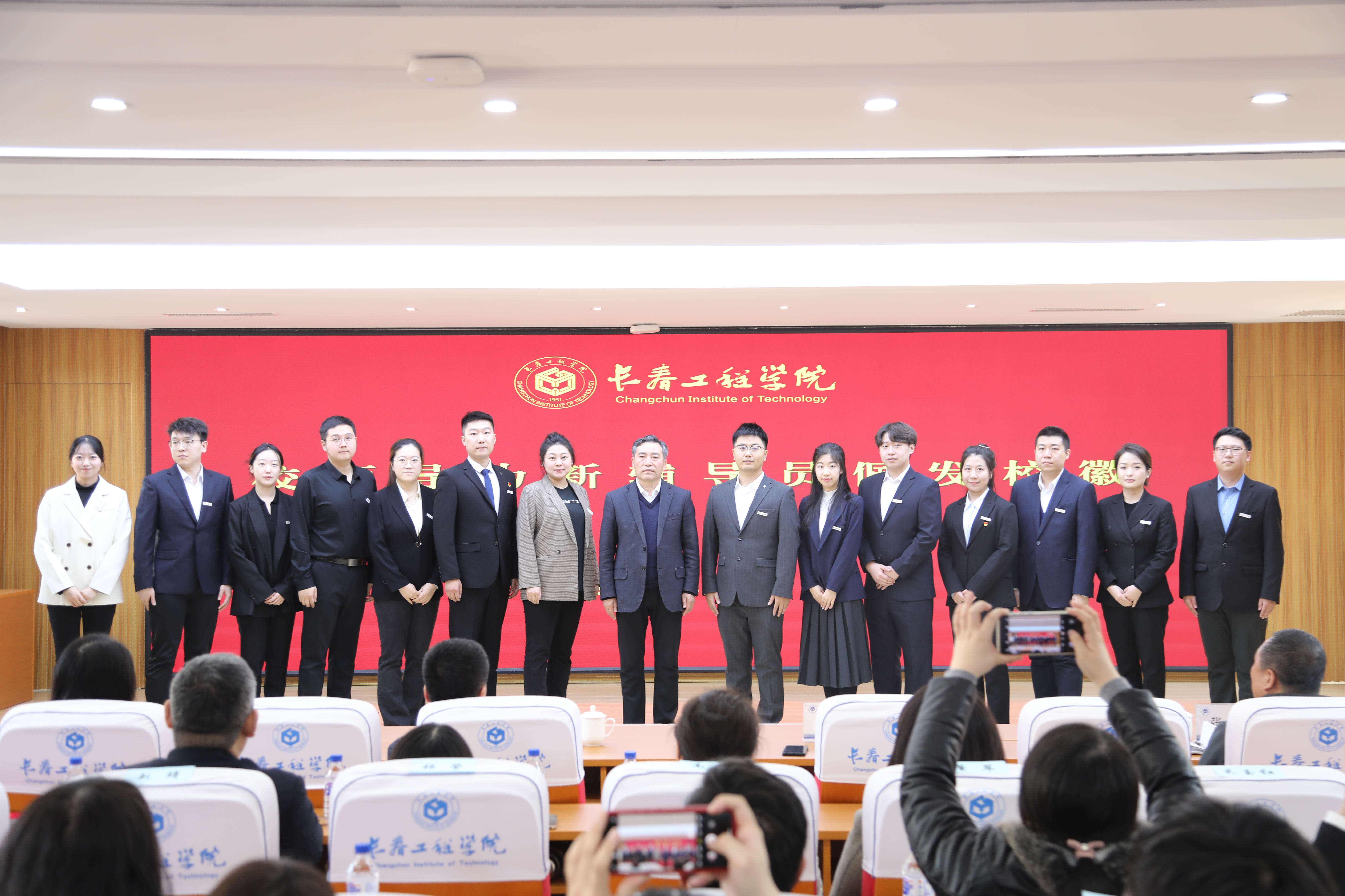 刘兆国副书记为新入职辅导员配发校徽,祝贺新入职辅导员成为一名光荣的长工程人。