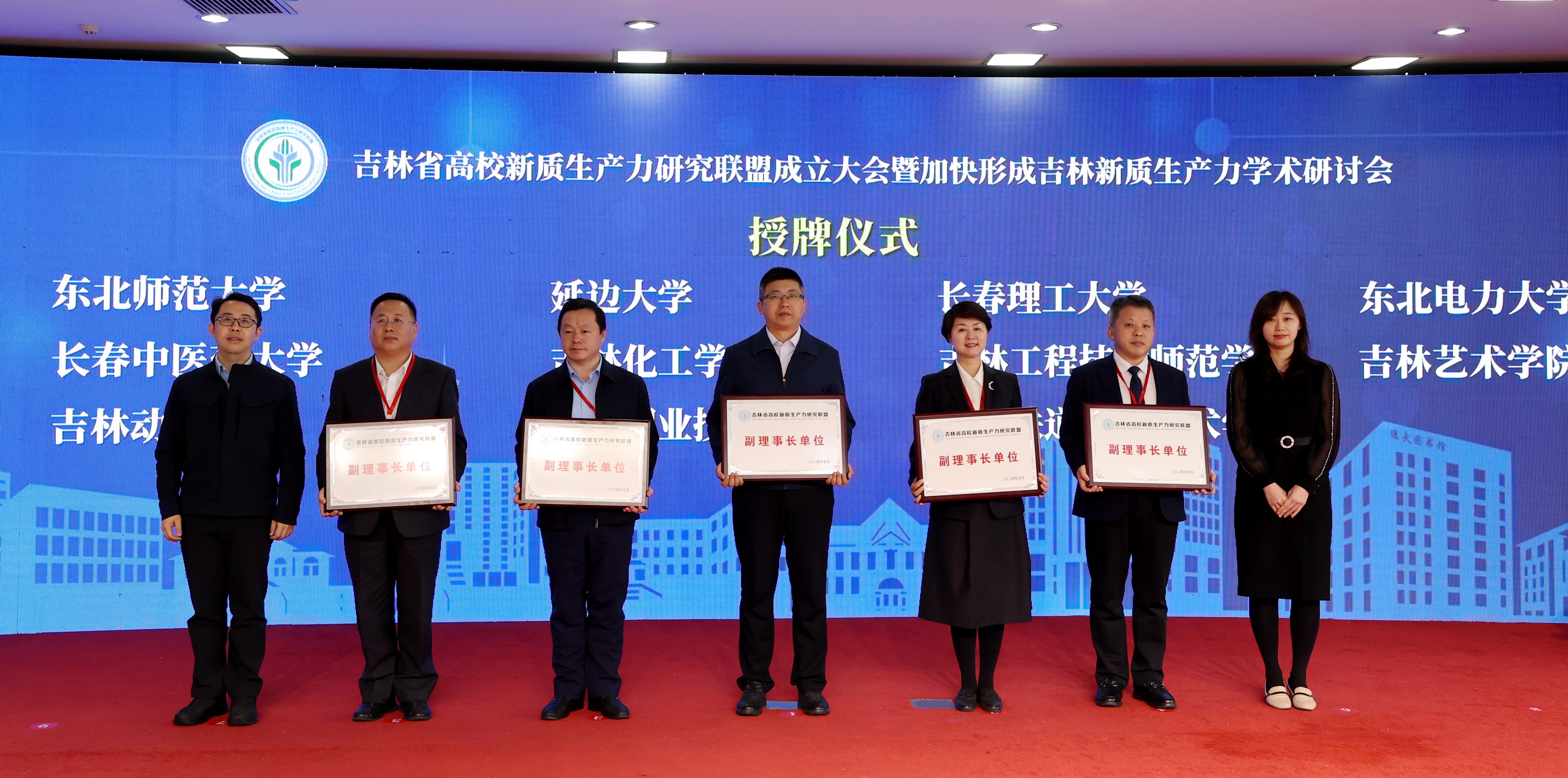 省教育厅刘学军副厅长、省科学技术厅二级巡视员辛德久与高校负责人代表共同为联盟成立揭牌。省教育厅刘学军副厅长、省科学技术厅二级巡视员辛德久、省教育厅闻博处长、省科学技术厅辛欣处长、中国科学院东北地理与农业生态研究所纪委书记项尚、中国科学院北京纳米能源与系统研究所产业办主任程廷海共同为联盟理事长、副理事长单位授牌。