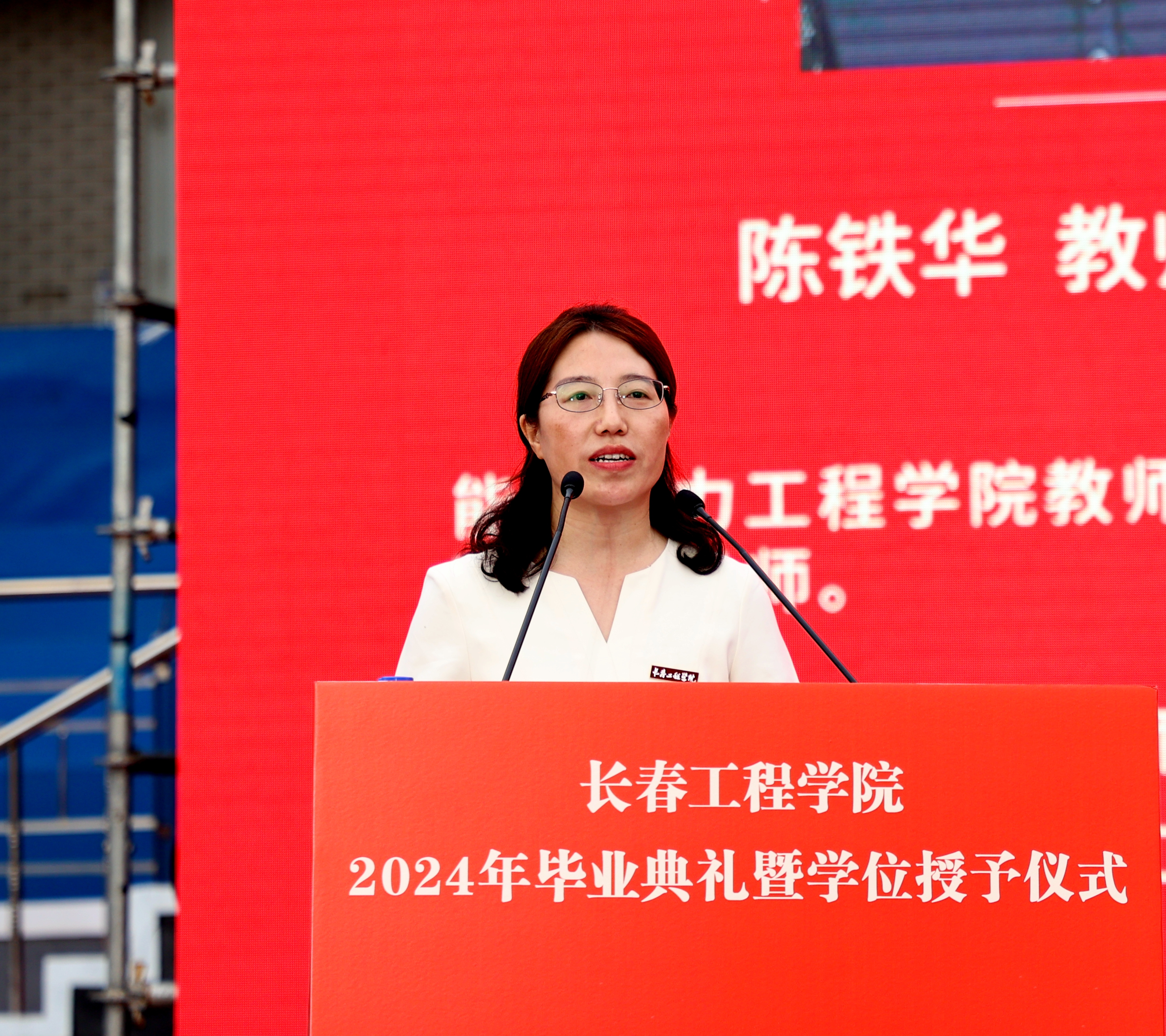 能源动力工程学院教师陈铁华作为教师代表发言,她代表全体教师向毕业生们表达了热烈的祝贺和美好的祝愿,并希望大家铭记校训精神,持续学习、不断进步,成为刚健自信、胸怀天下、担当有为的人。