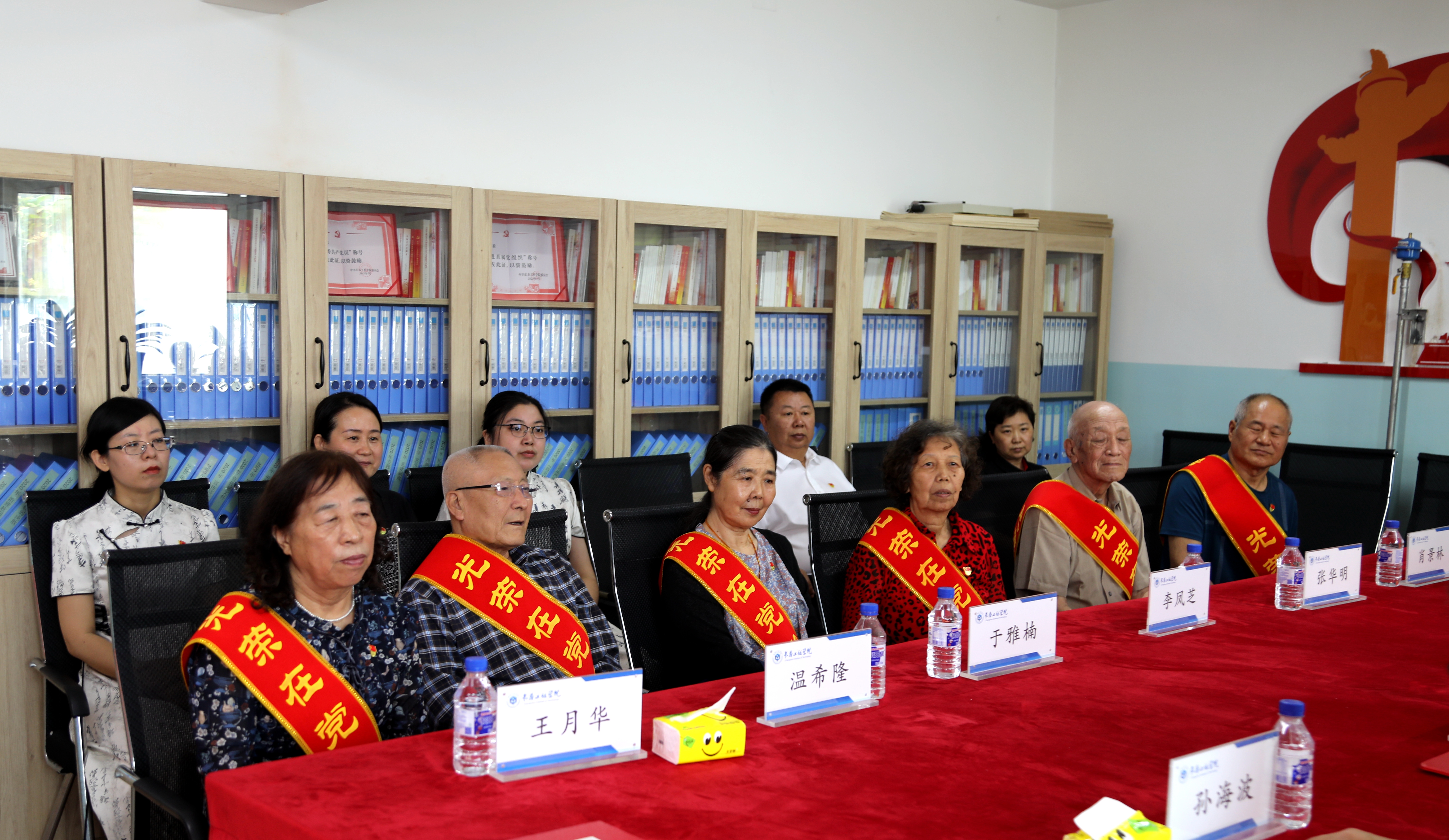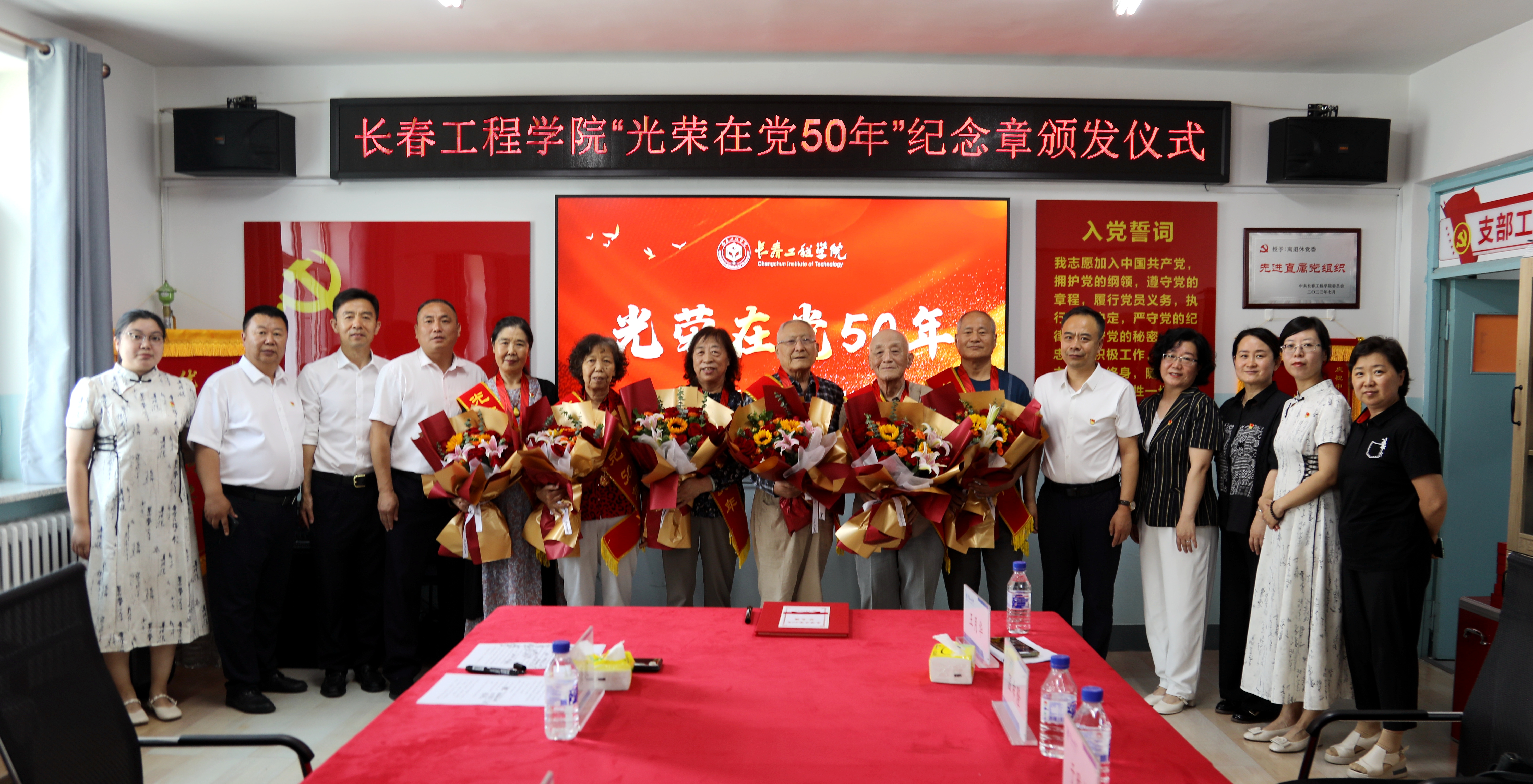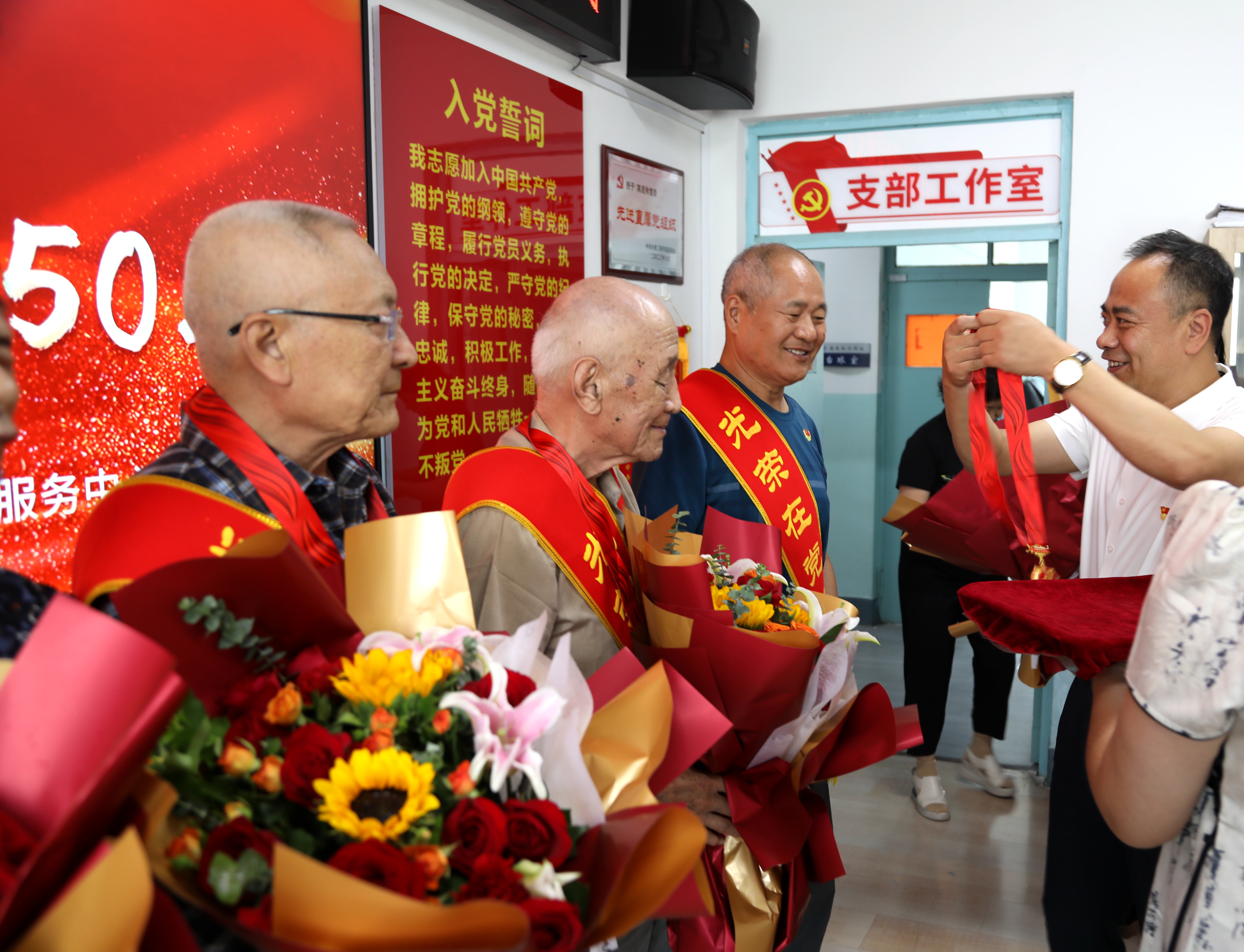 孟庆勇部长为心博在线平台(中国)官网党龄满50年的老党员王月华、温希隆、李凤芝、张华明、于雅楠、肖景林佩戴“光荣在党50年”纪念章,并献上鲜花。