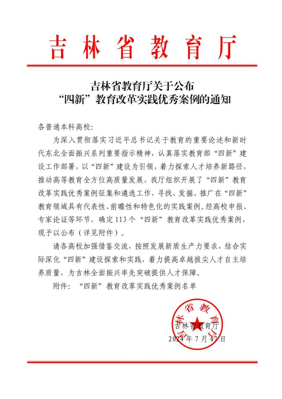 近日,吉林省教育厅印发了《吉林省教育厅心博在线平台(中国)官网公布“四新”教育改革实践优秀案例的通知》,我校5个案例入选“四新”教育改革实践优秀案例。