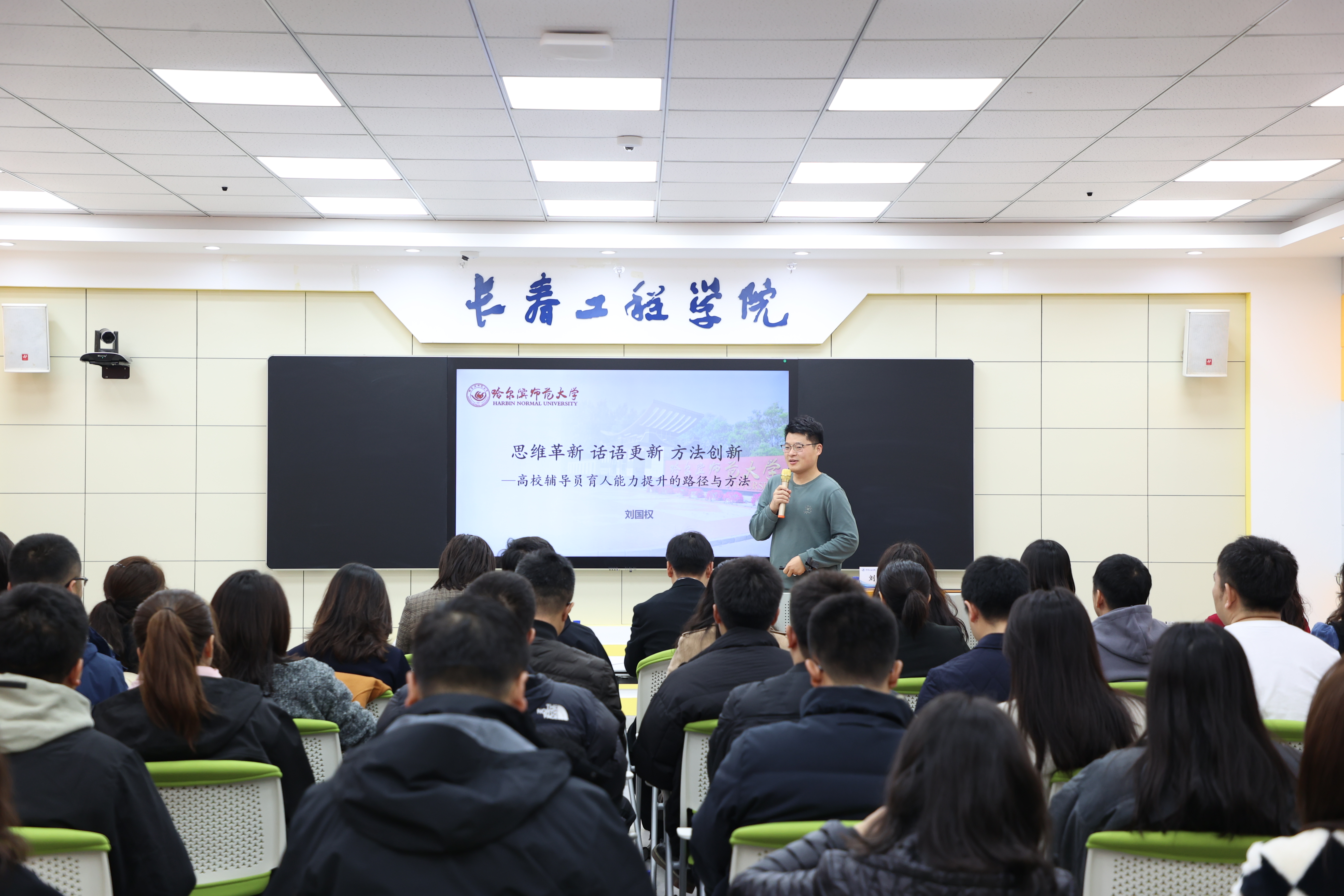 为进一步提升我校辅导员理论水平、专业素养和工作能力,聚焦学生工作队伍专业化、职业化建设,11月15日,党委学生工作部在第七教学楼会议室召开了“2024年辅导员素质能力提升专题培训会”,邀请全国“最美高校辅导员”、全国高校辅导员素质能力大赛一等奖获得者、哈尔滨师范大学融媒体中心主任、传媒学院辅导员刘国权为我校全体专职辅导员作专题培训。此次培训由党委学生工作部部长刘国松主持。