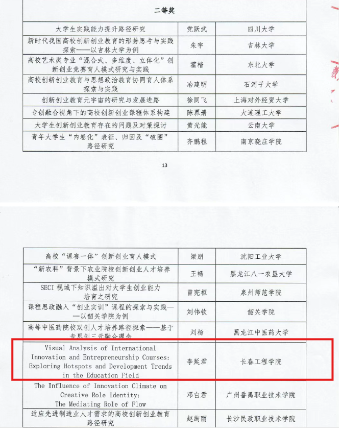 近日,中国高校创新创业教育联盟公示了2015-2024年深化高校创新创业教育改革优秀成果评审结果,我校教师获得“优秀课程”与“优秀论文”两项二等奖。