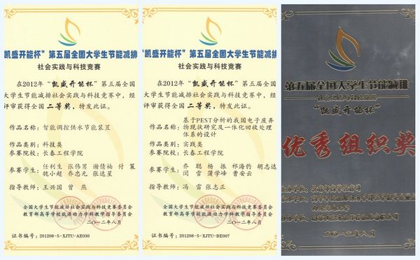 本次竞赛有203所高校参赛, 共2059件参赛作品。我校教务处和能源动力工程学院通过举办校级预赛,选出10件作品参加全国竞赛。经过专家网评,最终73所高校的141件作品进入决赛。由能源动力工程学院和电气与信息工程学院学生组成的代表队在该项赛事中表现突出,有2件作品闯入决赛。经过激烈角逐,为由王兴国、曾燕老师指导,任利生、杨国锋、魏小超、乔忠元、张伟男、谢倩楠、付策、张达星同学共同完成的《智能调控供水节能装置》荣获二等奖;由冯雷、张志正老师指导,乔聪、杨振、祁海豹、胡志达、闫雪、蒲学峰、曹安云同学共同完成的《基于PEST分析的我国电子废弃物现状研究及一体化回收处理体系的设计》荣获二等奖。我校参赛的《寒冷地区大坝弧门冻害防治系统研究》《高效平板式复合脉动热管太阳能集热器》《太阳能与辅助能源智能化采暖系统的设计与研究》《虹吸混合式节水设备》荣获三等奖。我校获得优秀组织奖。