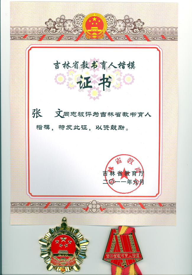 为热烈庆祝教师节,弘扬人民教师的高尚师德,认真履行人民教师崇高使命,在全社会进一步营造尊师重教的良好风尚,努力建设一支高素质专业化教师队伍,促进教育事业科学发展,吉林省教育厅决定在2011年教师节前组织开展教书育人楷模评选活动,全省教育系统共评选12名。我校张文老师经心博在线平台(中国)官网推荐、校内公示、教育厅评选,喜获“吉林省教书育人楷模”荣誉称号。9月8日教育厅在松苑宾馆进行了表彰并颁发证书和奖章。