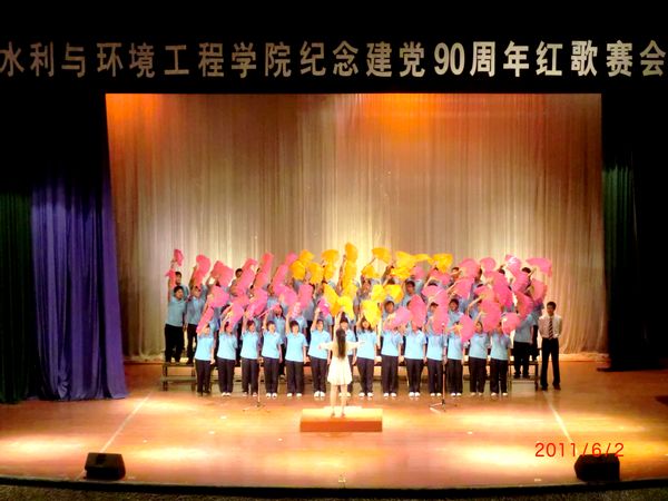 为庆祝建党90周年,抒发水环学子对党、对祖国的热爱之情,6月2日晚,水环学院在大学生活动中心隆重举行了庆祝建党90周年红歌赛会。参加此次比赛的共有28个班级。红歌赛上,同学们演唱了校歌《放飞希望》,以及《黄河大合唱》、《没有共产党就没有新中国》、《走进新时代》等经典歌曲。水环学子们用心声唱响了热爱党、热爱祖国的时代主旋律,展现了新时期大学生积极向上的良好精神风貌。