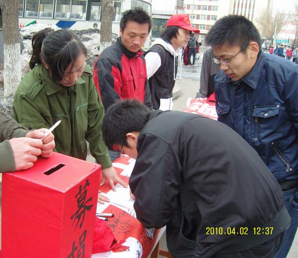 4月2日中午,募捐活动在湖西校区一食堂门前、第五教学楼前、湖东校区图书馆门前三个地点同时进行,各学院团委也分别根据自身情况组织学生以不同形式进行募捐。