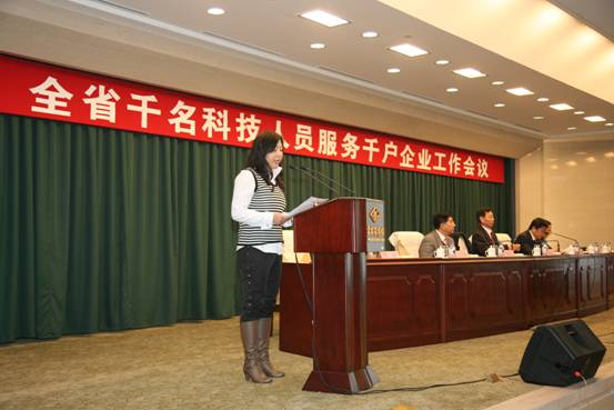董福湘作为“科技特派员” 代表在会上发言。她表示要树立高度的使命感、责任感、紧迫感,在加快科技成果转化、帮助企业开展技术研发、改善企业技术创新管理水平、帮助企业解决经营管理问题、为企业培养技术和管理人才、探索产学研合作的有效模式和长效机制方面做出应有的贡献。