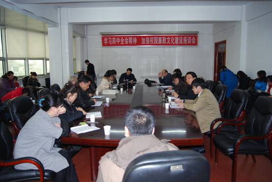 两个小时的座谈会气氛热烈,与会人员畅所欲言,就十七届四中全会的召开及《决定》的历史意义,廉政文化建设的内涵、定位、现实意义,教师在校园廉政文化建设中的责任和使命等内容做了讨论交流,并结合加强校风、教风、学风建设提出了工作建议。