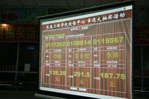 党委副书记吴占军现场抽取了学生就餐一等奖。本次活动共抽出9月份、10月份在学生食堂就餐的一等奖6名、二等奖16名、三等奖30名,共有52名同学成为幸运儿。纪检监察办公室张勇主任全程对抽奖活动进行了监督。当他宣布本次抽奖活动符合抽奖程序,结果真实有效时,全场响起了热烈的掌声。据饮食服务中心张广新介绍,饮食服务中心将按照活动方案,抽中一等奖、二等奖、三等奖的将按照当月消费额的100%、70%、50%的比例给予返还,金额直接打到获奖同学的消费卡中。此举在于鼓励更多的学生到学生食堂就餐。