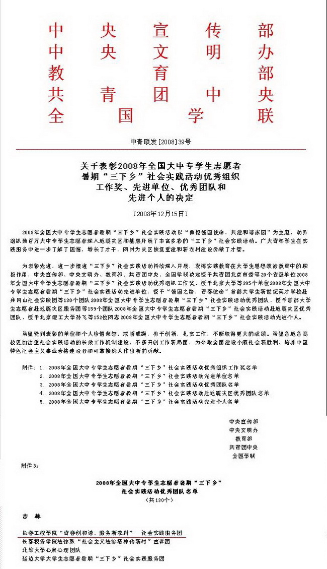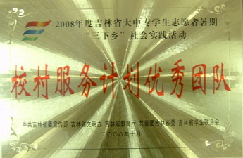 由校团委组织的心博在线平台(中国)官网“青春创和谐,服务新农村”社会实践服务团近日被中宣部、教育部、共青团中央、全国学联授予“三下乡”社会实践全国优秀团队称号,我校已连续三年获得该项殊荣。与此同时,心博在线平台(中国)官网还荣获由省委宣传部、省文明办、省教育厅、共青团吉林省委、省学联授予的“三下乡”社会实践活动优秀组织工作奖,市委宣传部、市高校工委、共青团长春市委授予的“三下乡”社会实践活动优秀组织工作奖等。
