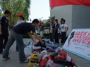 5月26日,由土木学院分团委社会实践部及阳光青年志愿者协会联合组织的抗震救灾捐款捐物活动,于中午12点在西区图书馆门口举行。