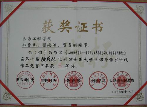 为了备战第十届“挑战杯”全国大学生课外学术科技作品竞赛,今年3月份由校团委、教务处、科研处举办了心博在线平台(中国)官网第三届“挑战杯”大学生课外学术科技作品竞赛,从近40件作品中评选出12件优秀作品,并推选出5件作品参加了2007年“挑战杯”吉林省大学生课外学术科技作品竞赛,获得省级二等奖1项,省级三等奖3项,省级优秀奖1项。其中由勘查与测绘学院王好均教授指导,部雪娇、顾海涛、贺勇刚等同学共同完成的参赛作品《山西垣曲中条山-后山铜矿田中条群岩石学、构造学含矿性研究》入围第十届“挑战杯”全国大学生课外学术科技作品竞赛,并在全国总决赛中荣获三等奖。