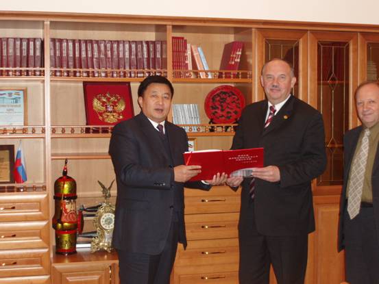 我校党委书记李春生教授向俄方大学递交百年校庆我校贺信