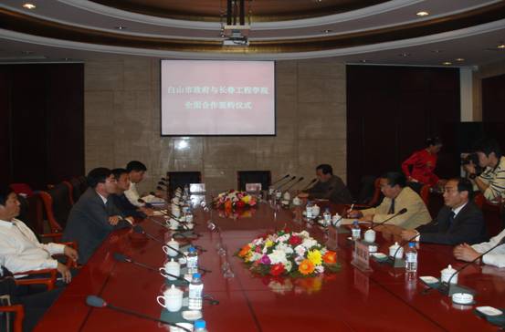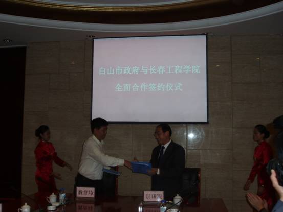 9月18日下午,我校与白山市人民政府全面合作协议签字仪式在白山市宾馆隆重举行。院长石曙光、纪委书记王时刚、副院长任玉珊和教务处、科研处、院办等职能部门负责人参加了签字仪式;白山市市委副书记、市长刘喜杰、副市长刘福涛及科技局、教育局、水务局、建设局等部门负责人参加了签字仪式。签字仪式由白山市副市长刘福涛主持。石曙光院长、刘喜杰市长代表双方签订了协议书。