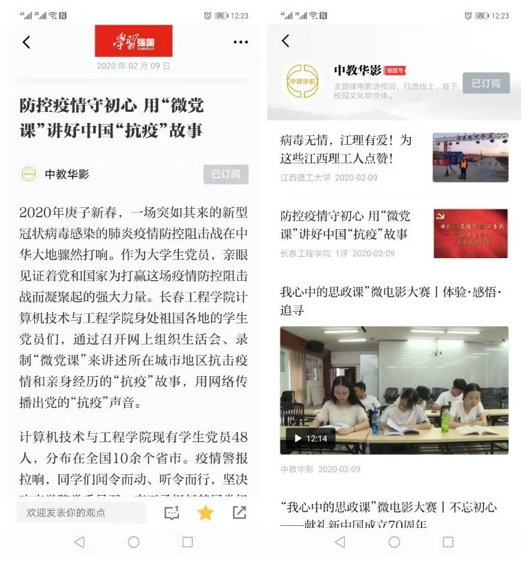 2020年2月9日,“学习强国”平台刊载了文章《防控疫情守初心 用“微党课”讲好中国“抗疫”故事》,文章报道了我校计算机技术与工程学院学生党员通过召开网上组织生活会、录制“微党课”的形式,讲述所在城市抗击疫情和亲身经历的“抗疫”故事,用网络传播出党的“抗疫”声音。