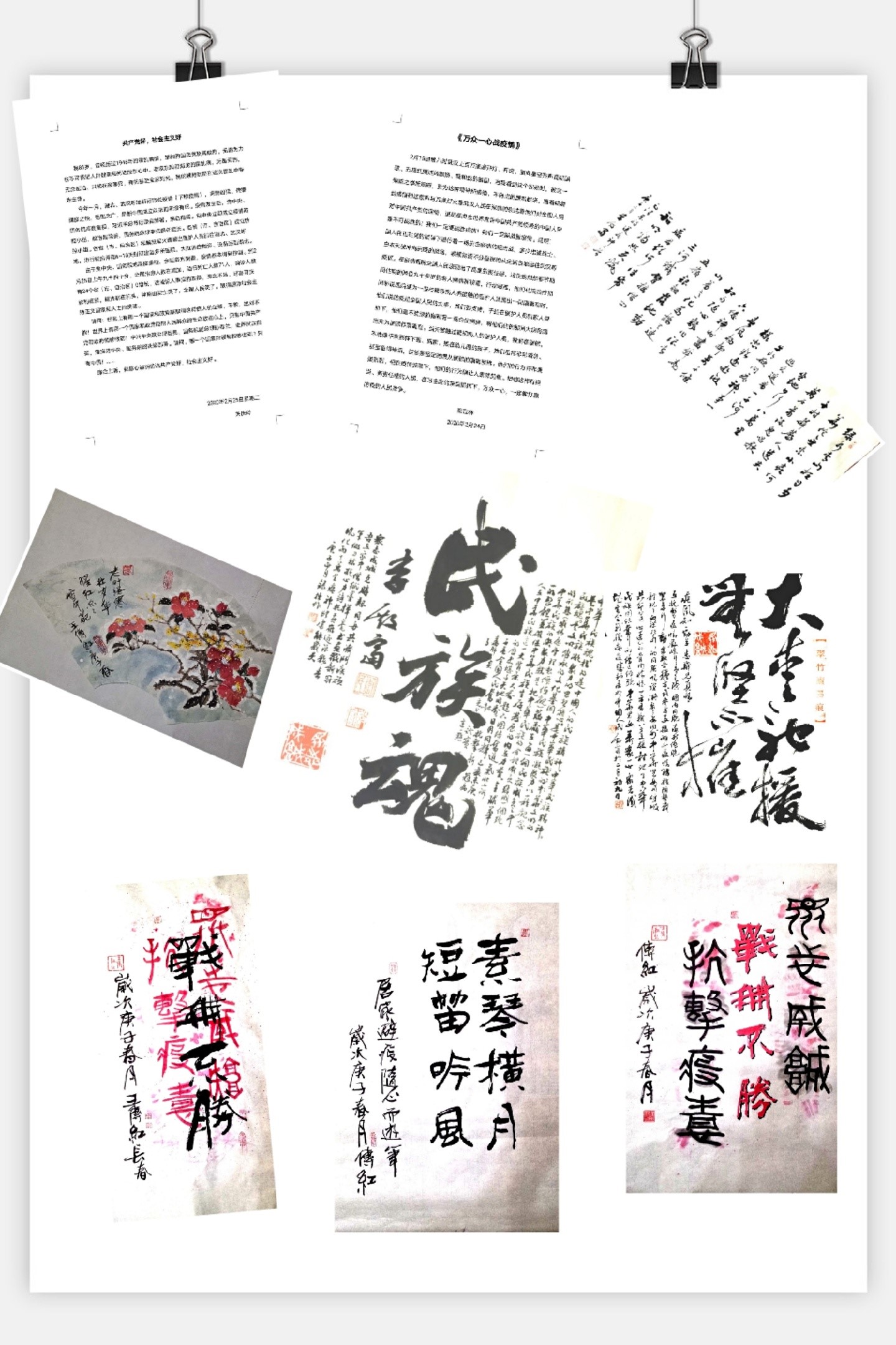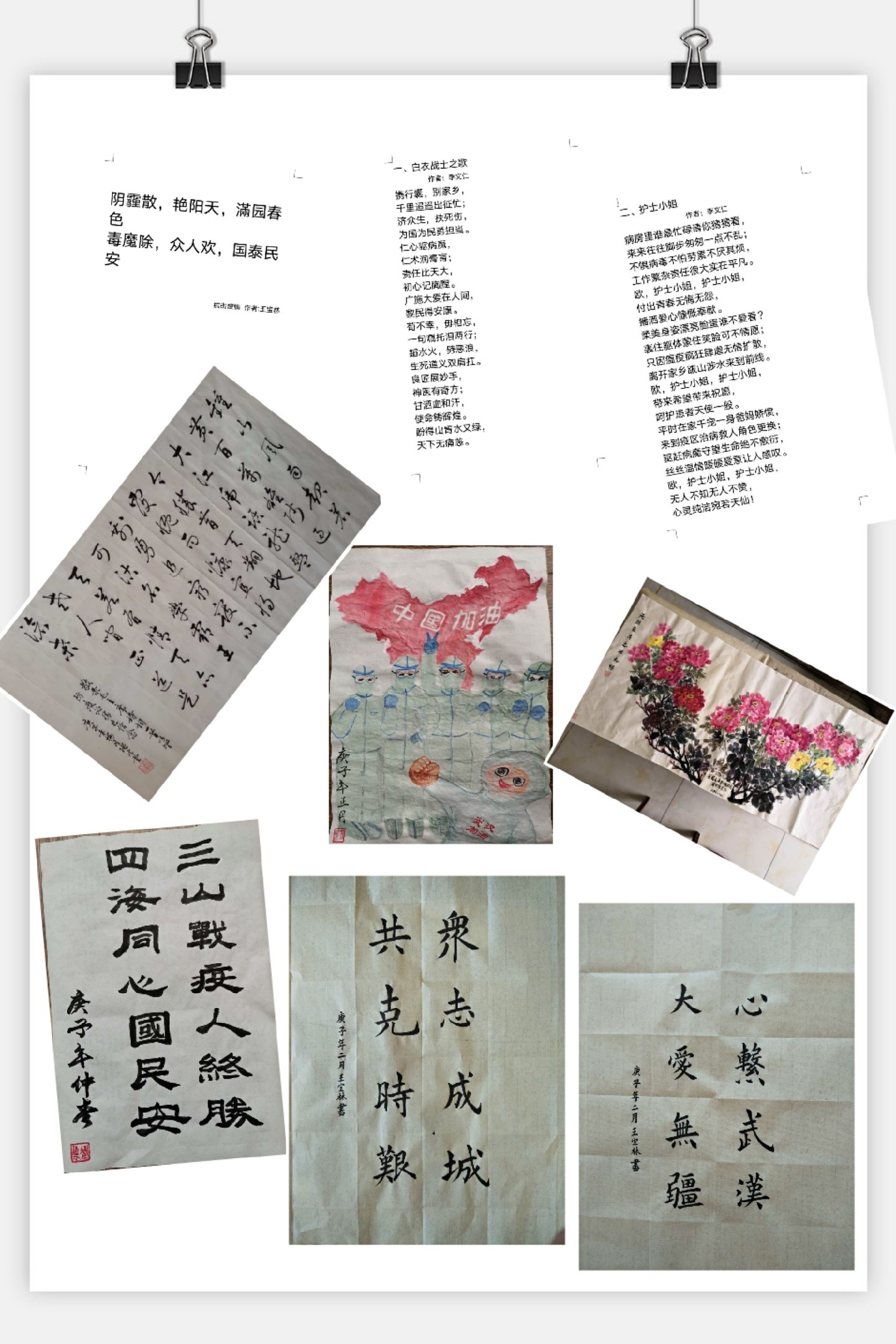 活动共收集到作品近20幅(篇),离退休的老同志们用书法、绘画、诗歌等形式表达了对党中央决策部署的支持,对战胜疫情的信心,对“逆行者”们的敬意。他们以这种方式为这场生命健康保卫战助力!为自己加油,为武汉加油,为祖国加油!