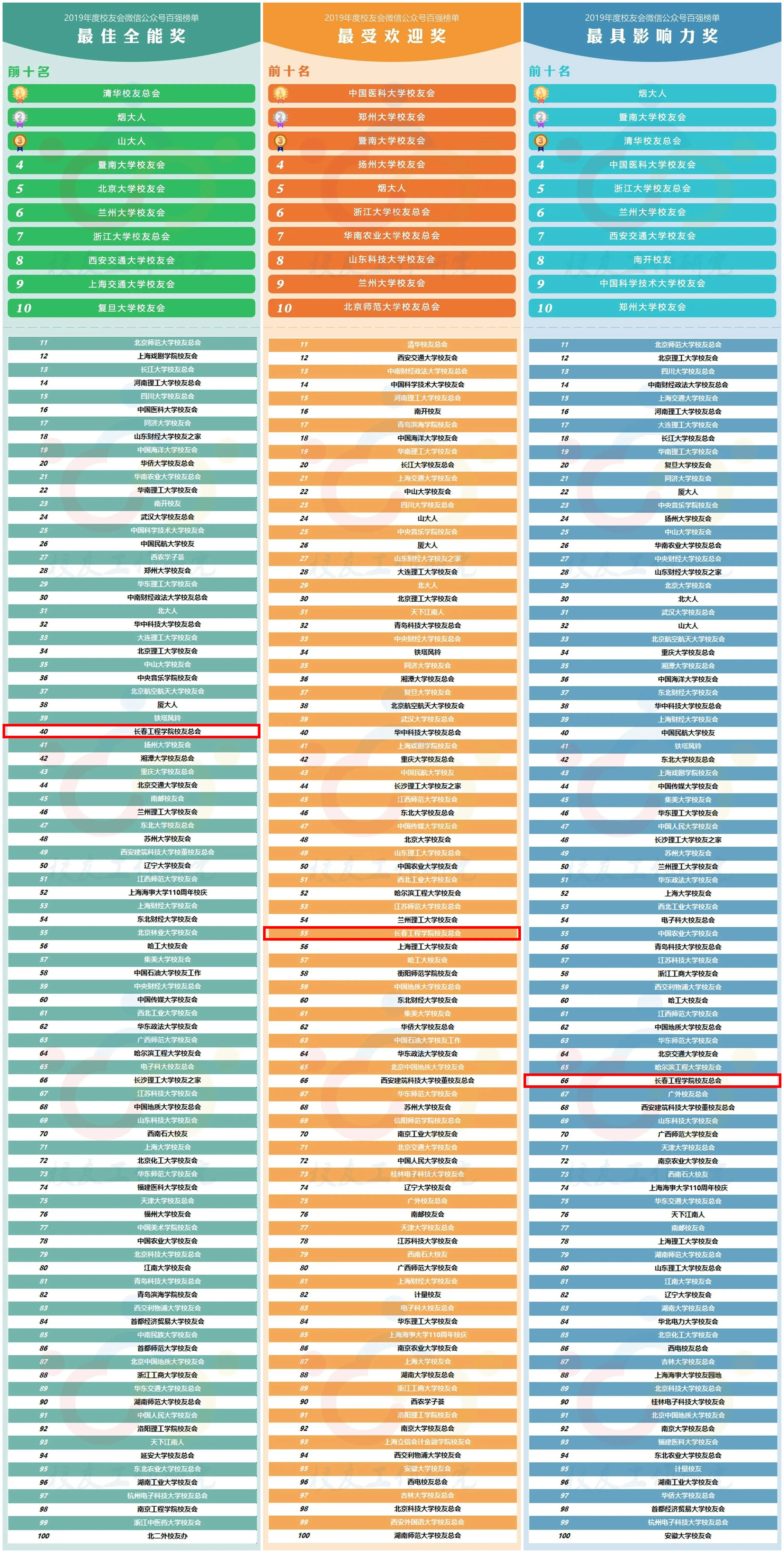 全国高校“2019年度校友会微信公众号百强榜单”是基于全国390余个高校校友会公众号在2019年度的运行情况综合评价产生。其中“最佳全能奖”为该公众号当年度的文章阅读总量、点赞总量、发布文章总量、文章平均阅读量、文章平均点赞量等关键指标排名;“最受欢迎奖”为当年度公众号文章的在看量排名;“最具影响力奖”为当年度公众号文章的阅读总量排名。