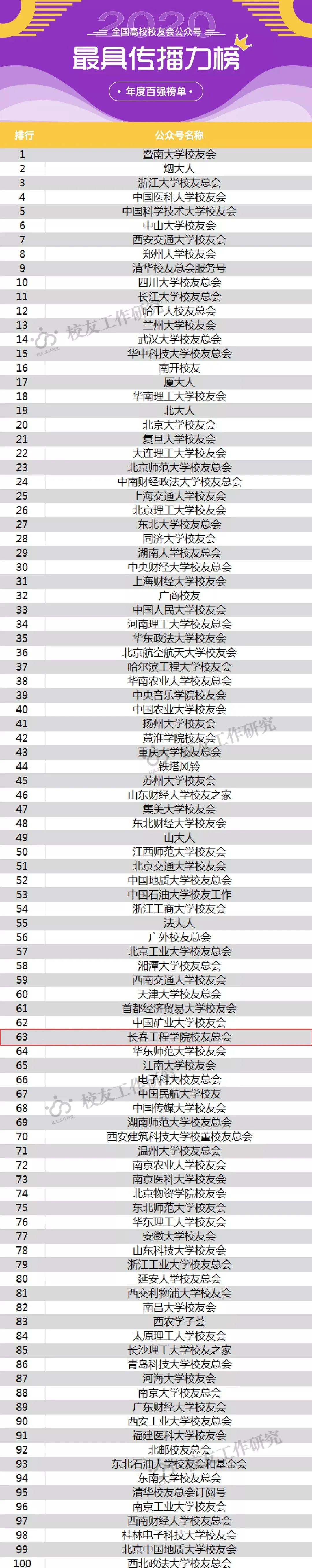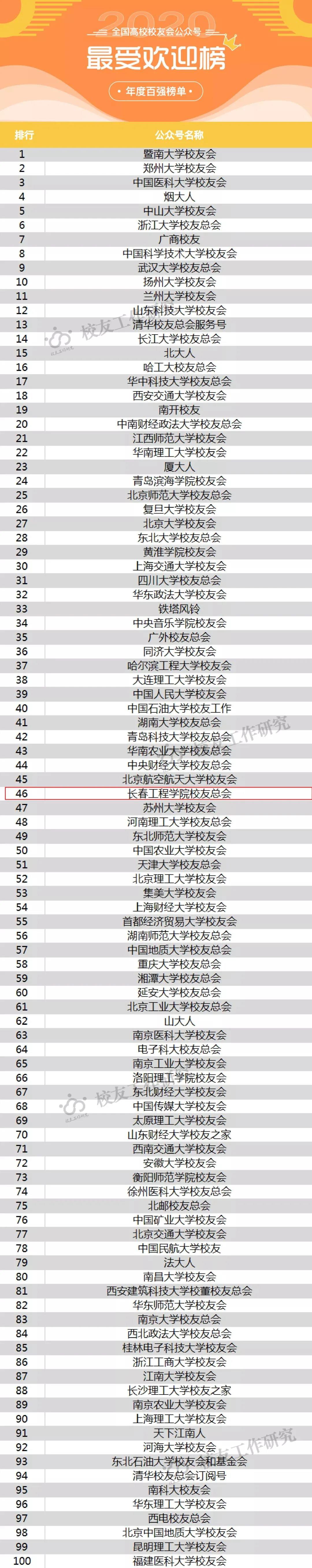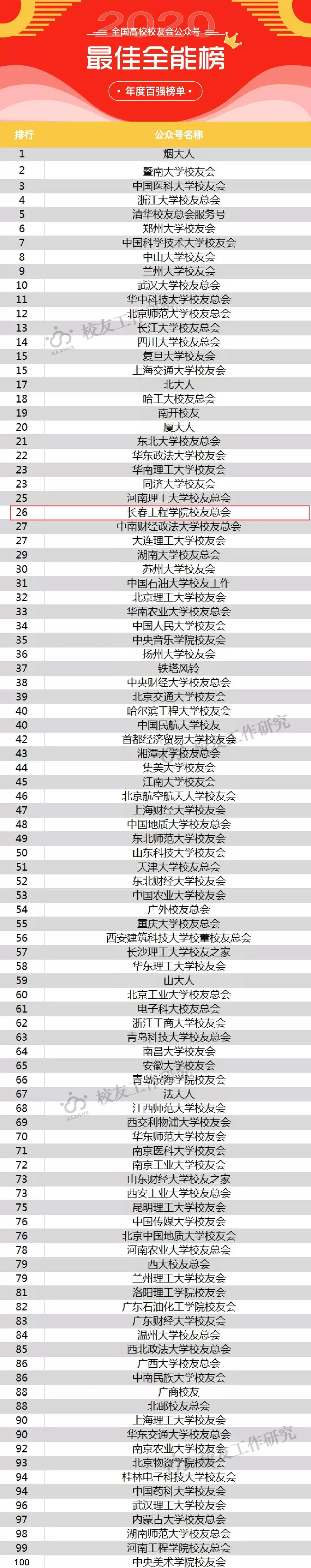 2月5日,“校友工作研究”发布了《全国高校校友会微信公众号2020年度百强榜单》,“心博在线平台(中国)官网校友总会”分别位列“最佳全能榜”第26位、“最受欢迎榜”第46位、“最具传播力榜”第63位,以上三个榜单均比上一年度有所提升,其中代表综合成绩的“最佳全能榜”已连续三年位列吉林省第1位。该榜单是基于“校友工作研究”收集的全国400多个高校校友会公众号样本库产生。