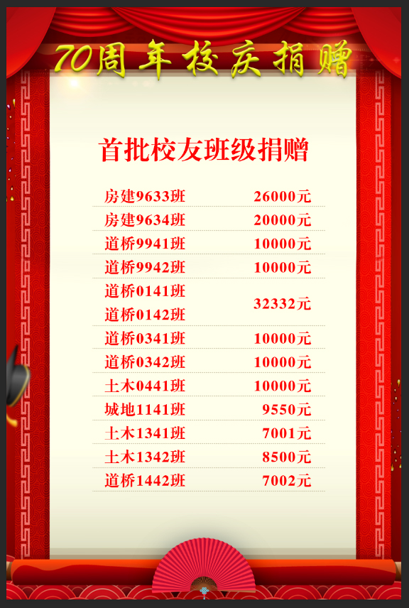 首批以班级为单位捐赠的土木工程学院的13个班级有:房建9633班、房建9634班、道桥9941班、道桥9942班、道桥0141班、道桥0142班、道桥0341班、道桥0342班、土木0441班、城地1141班、土木1341班、土木1342班、道桥1442班。校友们纷纷表达了对母校70周年华诞的祝福,希望为母校提供力所能及的支持,并祝愿校庆取得圆满成功。