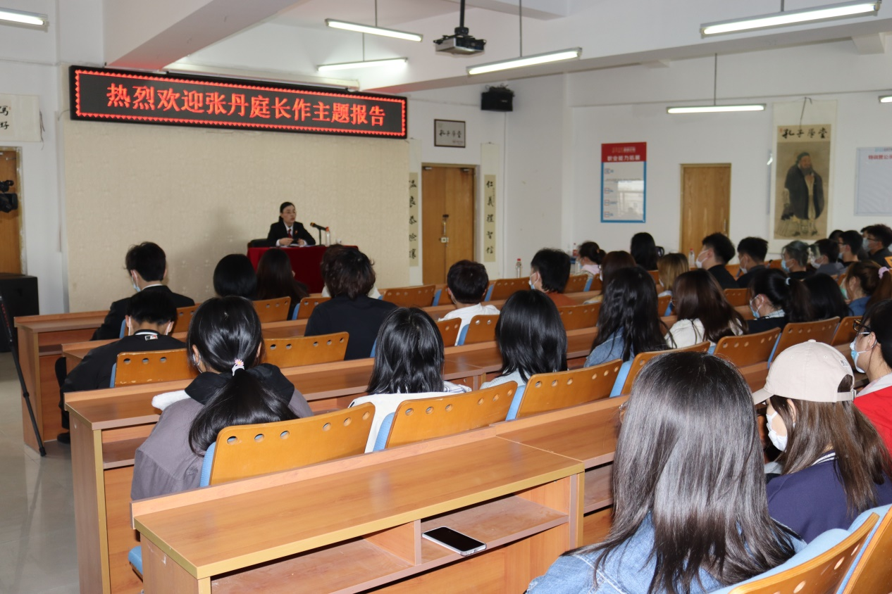 张丹庭长讲述了法律的重要性及意义,并通过近年来发生在我们身边的案例深入浅出地为大家阐述了盗窃罪、诈骗罪、危险驾驶罪、国家级考试作弊行为、故意伤害罪、聚众斗殴、寻讯滋事、非法拘禁、毒品犯罪等犯罪行为的司法解释及严重后果,为学生科普宣传了一些基本法律知识。讲座结束后是互动环节,同学们咨询了法律相关问题,张丹庭长为同学们作出解答,帮助大家进一步了解法律知识。
