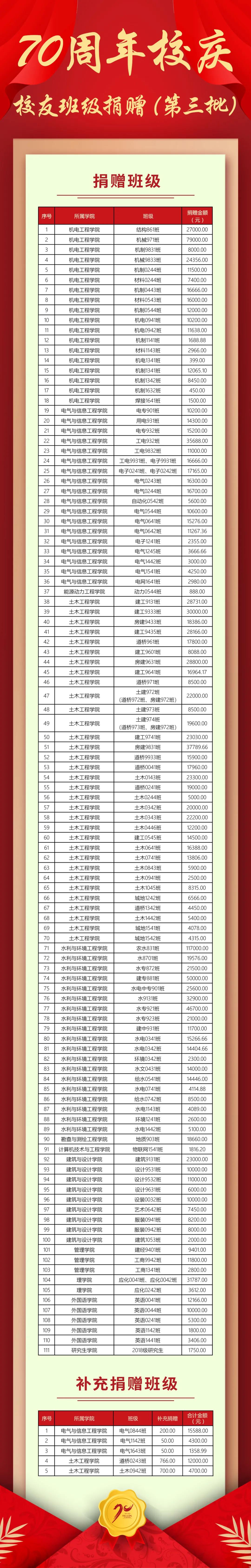 【校庆捐赠】200余个校友班级捐赠贺母校70华诞