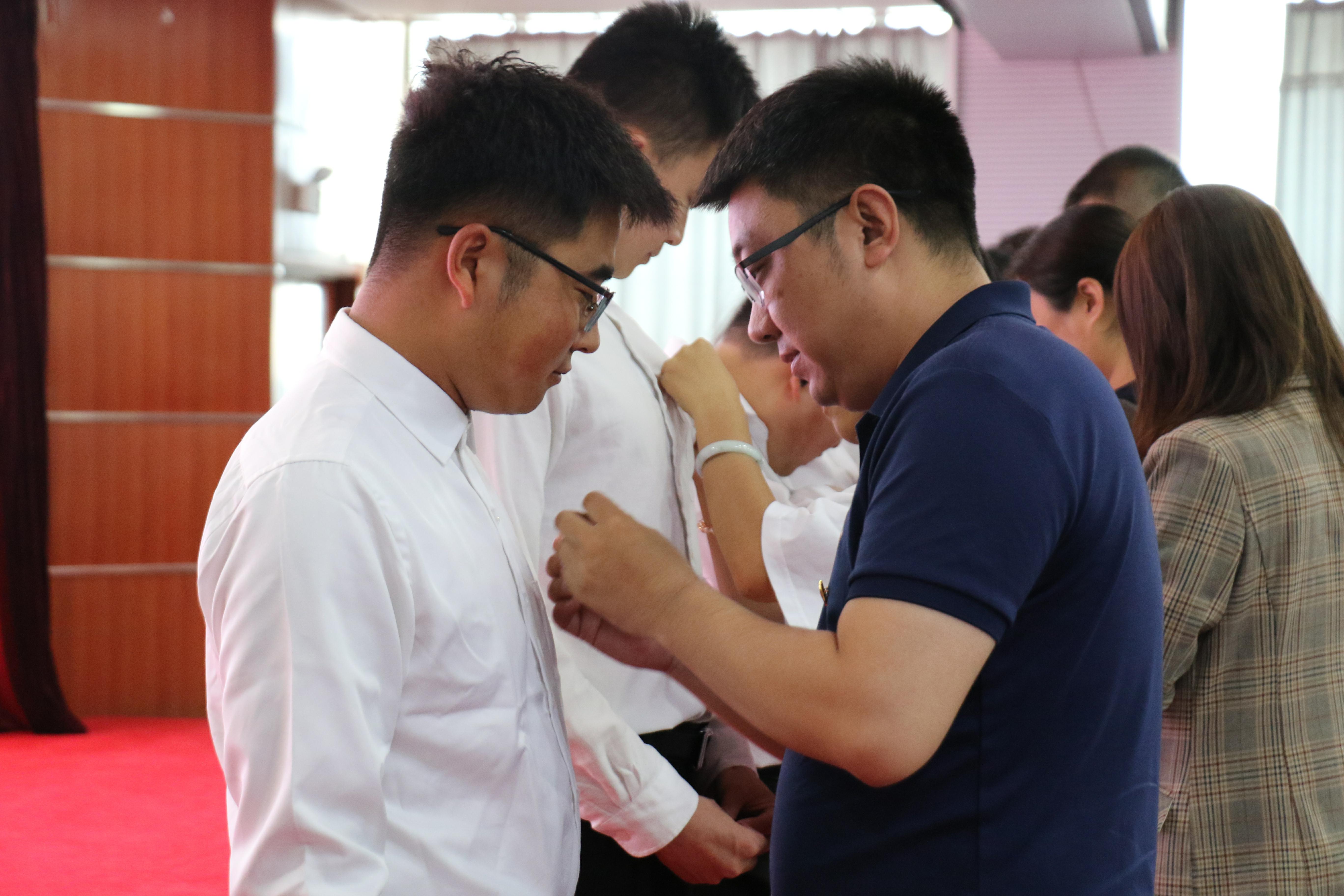 会上,各学院学生党支部书记、兼职组织员老师为学生党员代表佩戴党徽。