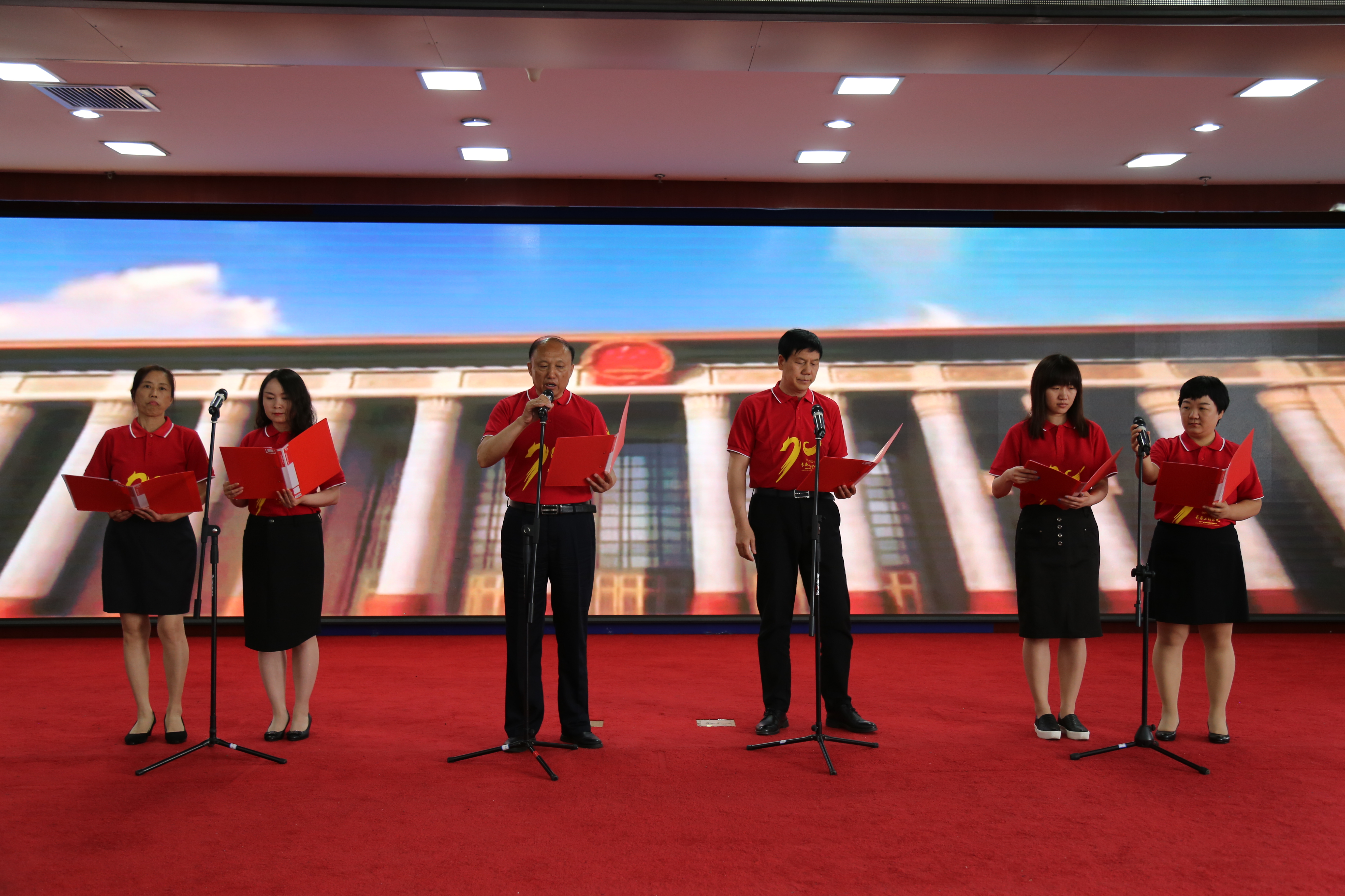 诗歌朗诵会在配乐诗朗诵《我们的旗帜永不褪色》的铮铮誓言中拉开帷幕。第一党支部的《百年征程》将中国共产党自强不息、与时俱进,一次次带领中华民族从胜利走向胜利的光辉历史激情赞颂;总服务部《七月的天空》将红色的希望、辉煌的梦想热情歌咏;《祖国啊,我亲爱的祖国》《有一首歌——没有共产党就没有新中国》《心中的太阳》《党旗颂》……一首首诗歌饱含着教工们对祖国深深的眷恋和美好祝愿,诵咏出共产党员对人民的赤诚之心。