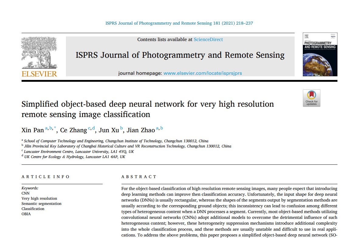 论文以“Simplified object-based deep neural network for very high resolution remote sensing image classification”为题,作者为潘欣等。