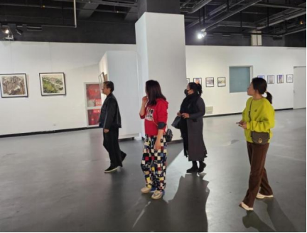 座谈会结束后,科研团队参观了北京工业大学艺术设计学院视觉艺术馆,馆中展示的学生中国画、书法等优秀作品吸引了各位老师。学生的作品以丰富的视觉语言展现了北京工业大学学子的校园生活以及看待问题的视角与思考,也体现了北京工业大学艺术设计学院的人才培养水平。参观中,科研团队与艺术馆教师就学生作品及如何布展进行了交流。